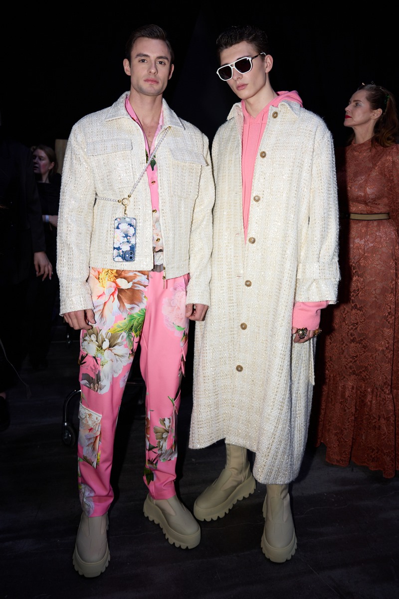 BERLIN, GERMANY – FEBRUARY 07: (L-R) A guest, Timur Bartels and Rebecca Kunikowski attend the Marcel Ostertag Fashion show as part of Berlin Fashion Week AW24 on February 07, 2024 in Berlin, Germany. (Photo by Andreas Rentz/Getty Images)