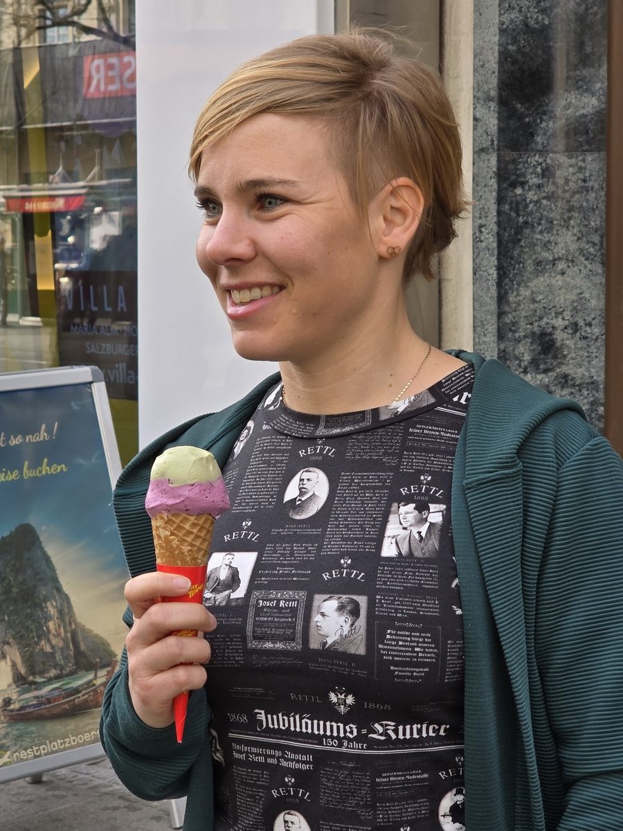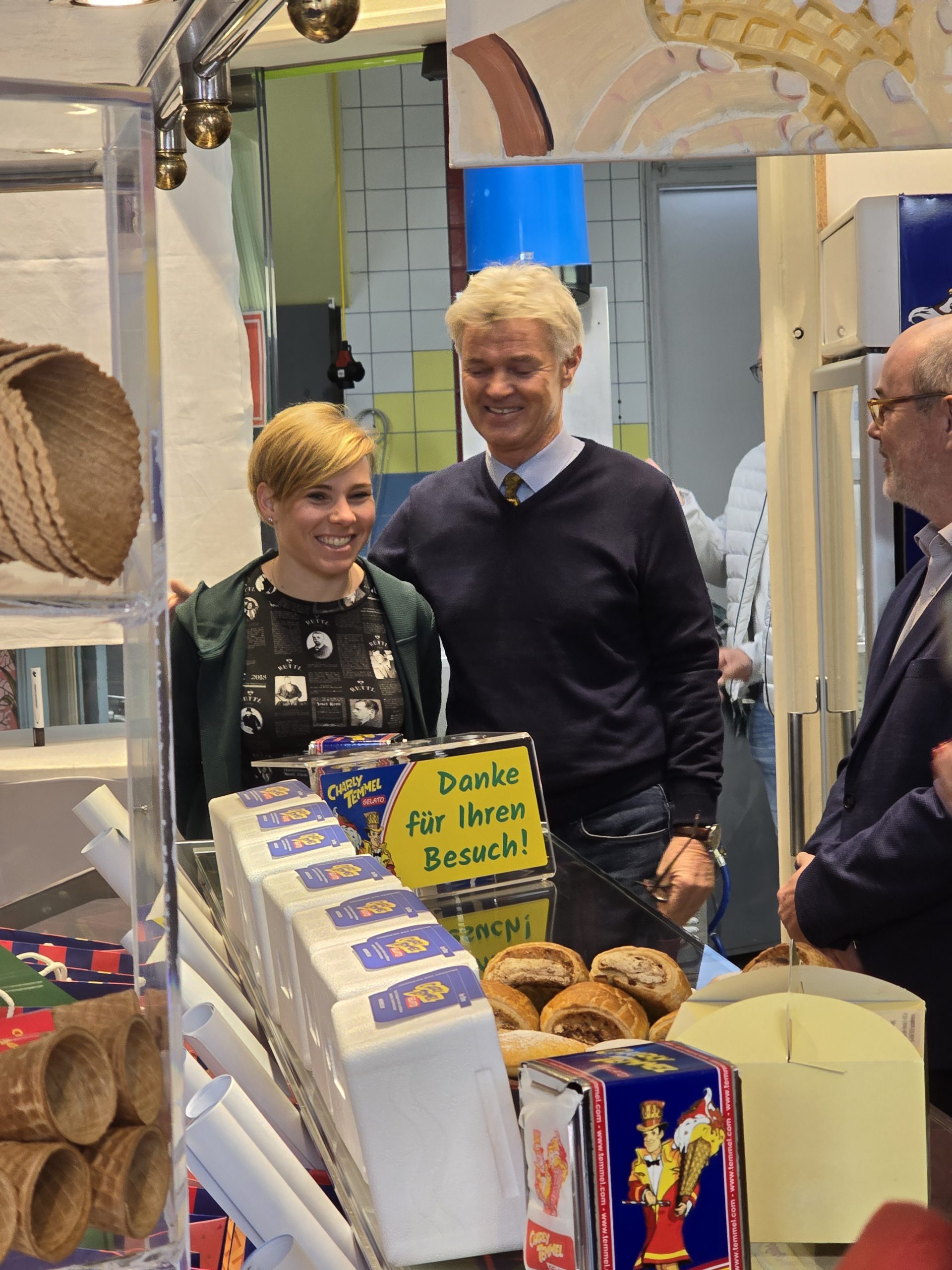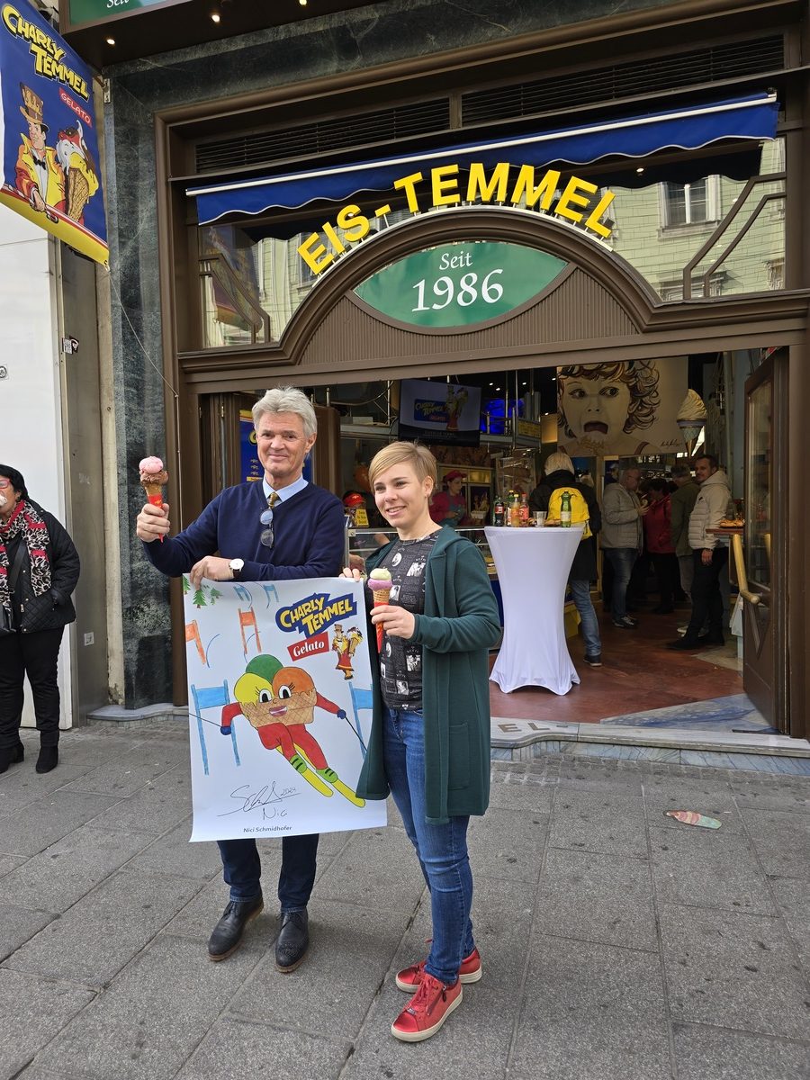 „Ich habe mich 1981 selbstständig gemacht und ich freue mich heute noch gleich wie damals über jeden einzelnen Kunden“, beteuert Charly Temmel bei der Eröffnung und bedankt sich bei Medien und Wegbegleitern. Er freute sich riesig darüber, für das heurige Charly Temmel-Eis-Plakat die ehemalige Profi-Skirennläuferin Nici Schmidhofer gewonnen zu haben. Sehr offen erklärt diese, dass sie das Plakat mit Hilfe ihrer Cousine gestaltete: eine skifahrende Eiswaffel. Dass eine Waffel am Plakat ist, war ihr besonders wichtig, „denn Eis ohne eine gute Waffel kann man vergessen“, ist sie überzeugt. Außerdem findet sie, dass Eiswaffeln und Skifahren gut harmoniere – es geht bei beiden um Eis.