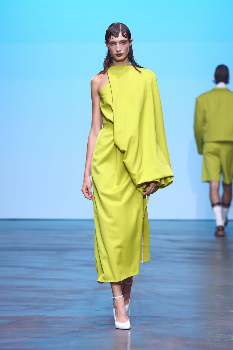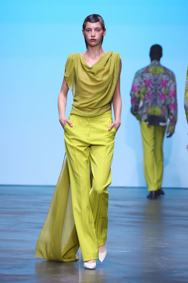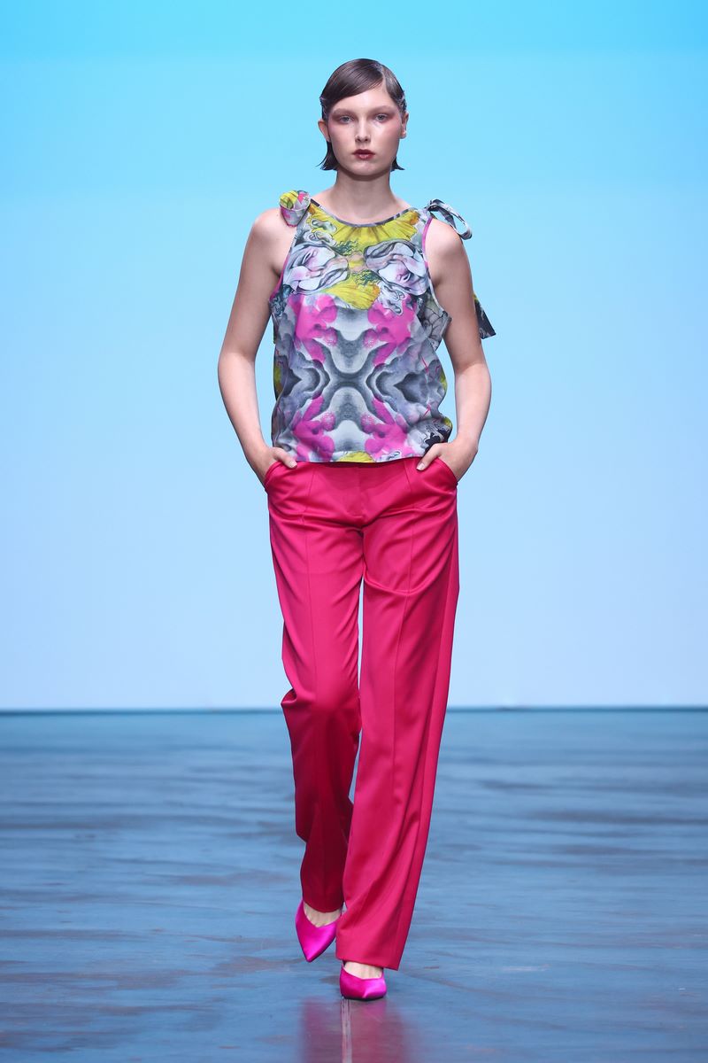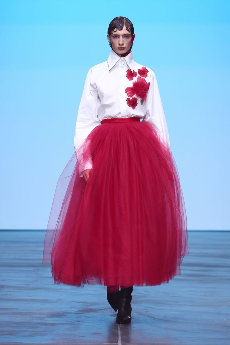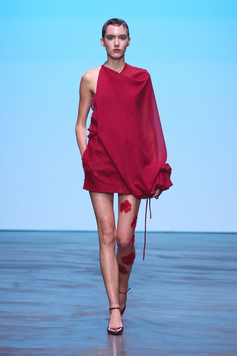 Das Herzstück dieser gefühlsbetonten SS25 Kollektion bilden lebhafte Rottöne in verschiedenen Nuancen. In Kombination mit Grau, Schwarz, Weiß und Limettengrün kommt die kontrastreiche Farbpalette vor allem bei schwerfallenden Stoffen zum Einsatz.