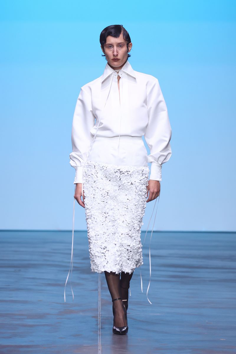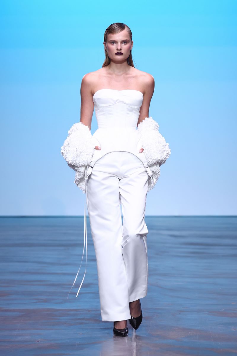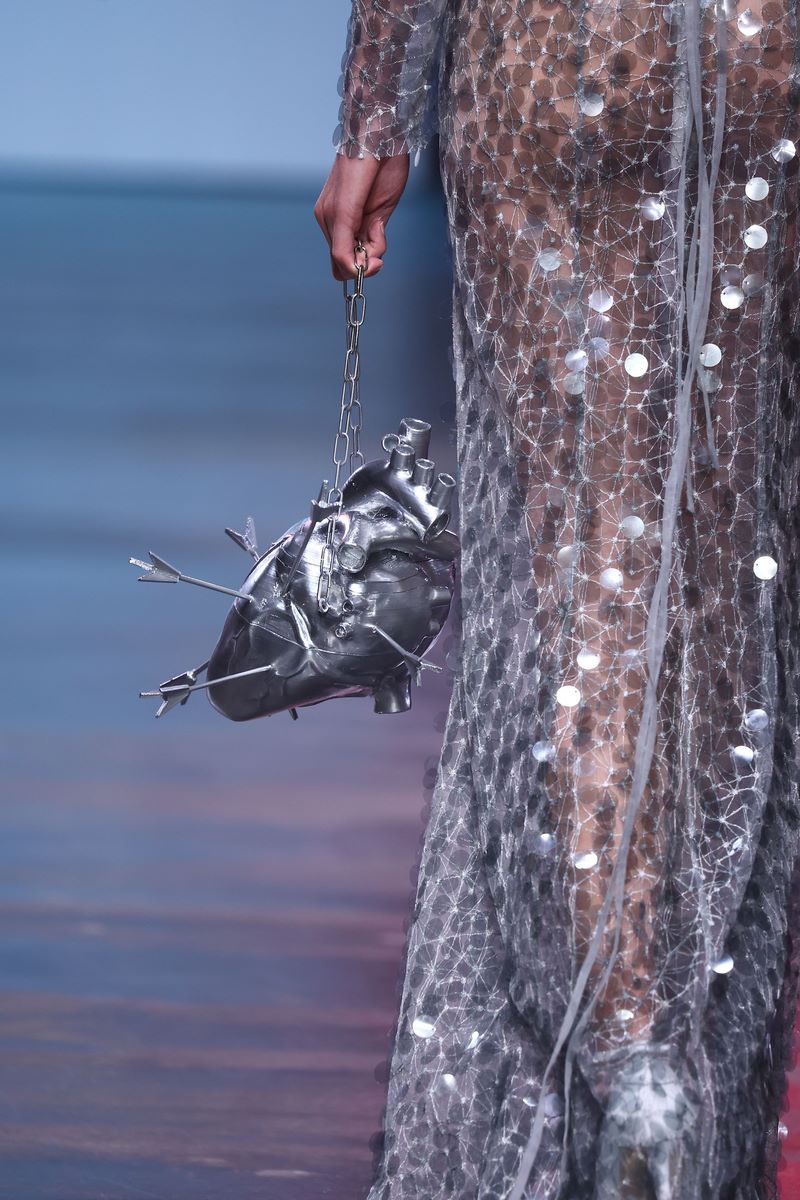 Recyceltes Leder, welches der Kollektion eine gewisse Härte und Robustheit verleiht, geht eine Symbiose mit aufwändigen Drapierungen ein, die wiederum subtil an die griechisch-römische Antike mit all ihrer Mythologie und den daraus entstammenden Liebesgott Armor erinnern. Verworrenene, dreidimensionale Blütenstrukturen auf einem Jaquette aus reinweißem Stoff vermitteln ein Gefühl von Chaos, während Häkelelemente dem Spiel mit dem Schein und Sein eine humorvolle Note verleihen.