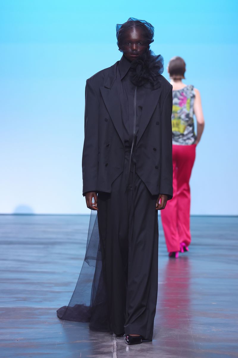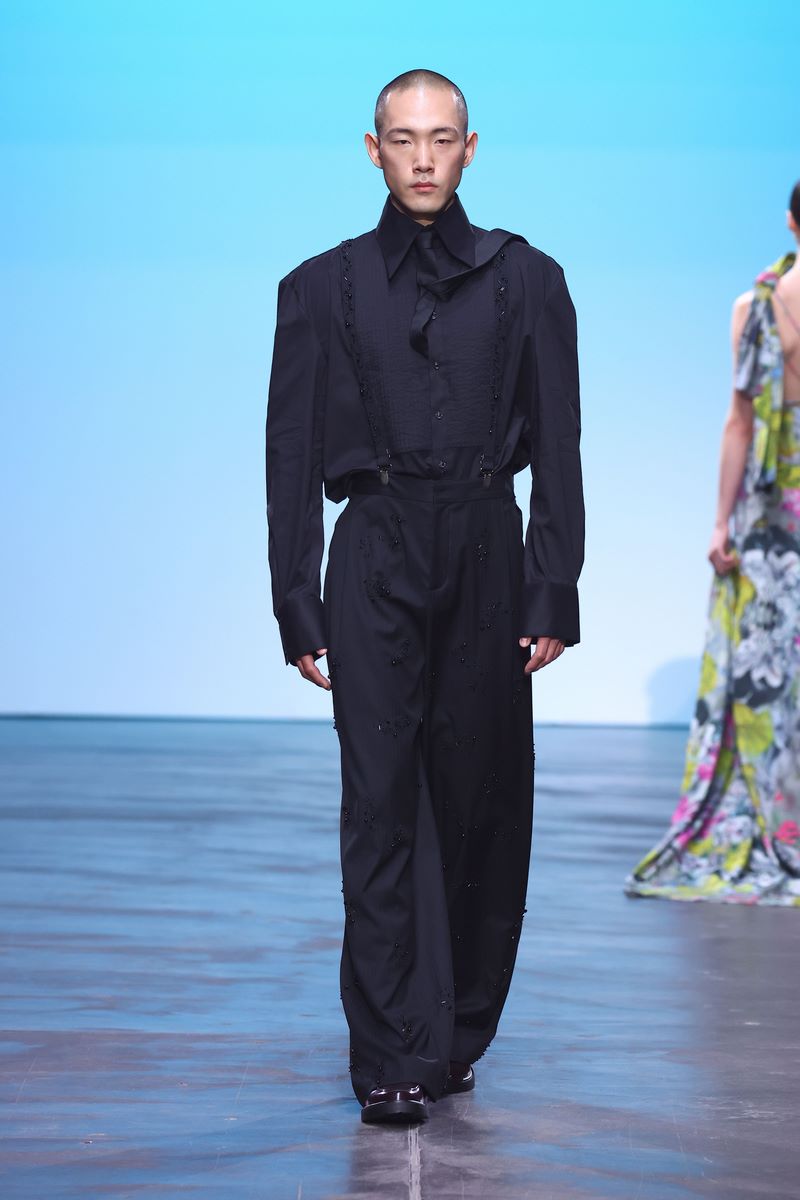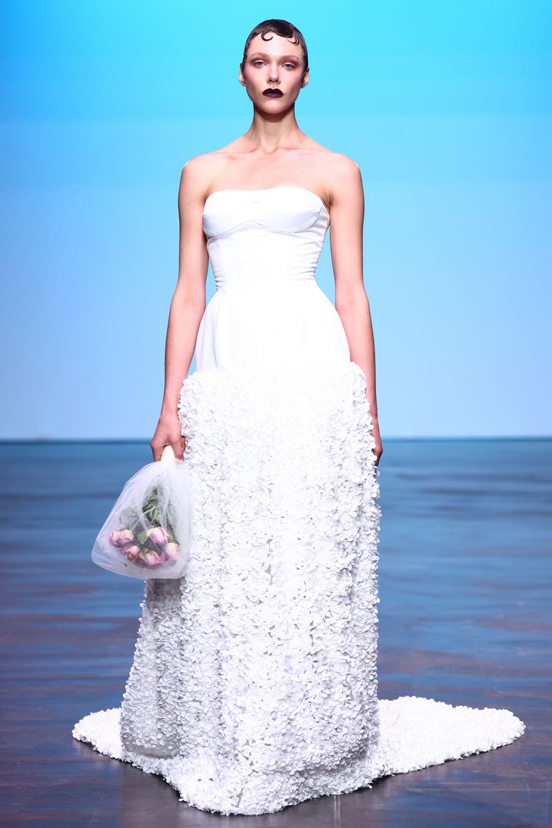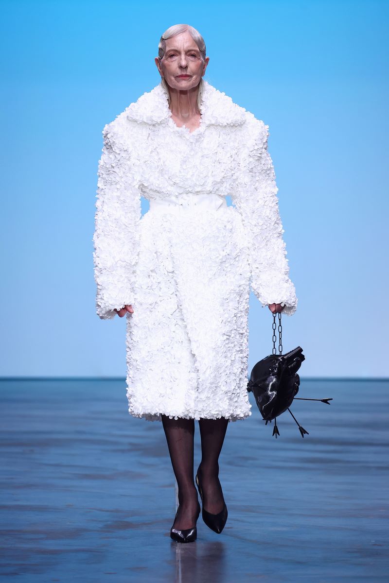 Recyceltes Leder, welches der Kollektion eine gewisse Härte und Robustheit verleiht, geht eine Symbiose mit aufwändigen Drapierungen ein, die wiederum subtil an die griechisch-römische Antike mit all ihrer Mythologie und den daraus entstammenden Liebesgott Armor erinnern. Verworrenene, dreidimensionale Blütenstrukturen auf einem Jaquette aus reinweißem Stoff vermitteln ein Gefühl von Chaos, während Häkelelemente dem Spiel mit dem Schein und Sein eine humorvolle Note verleihen.