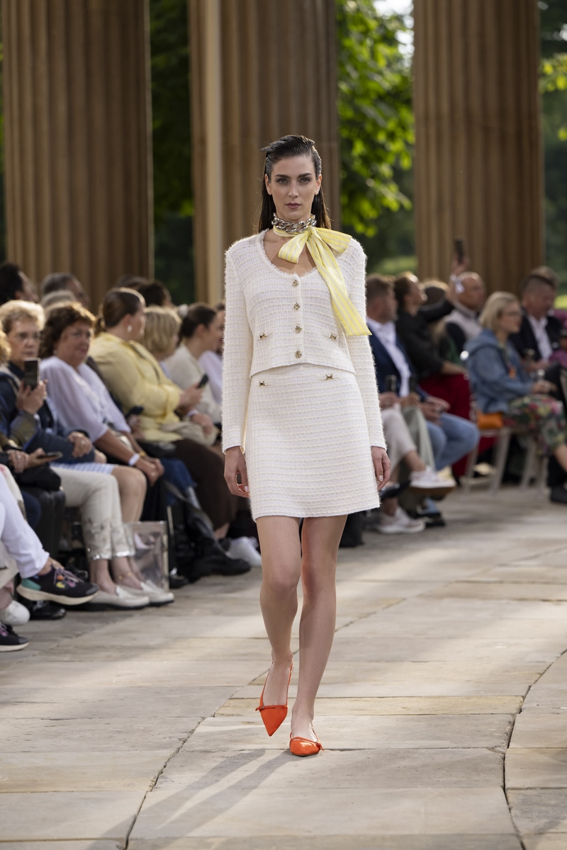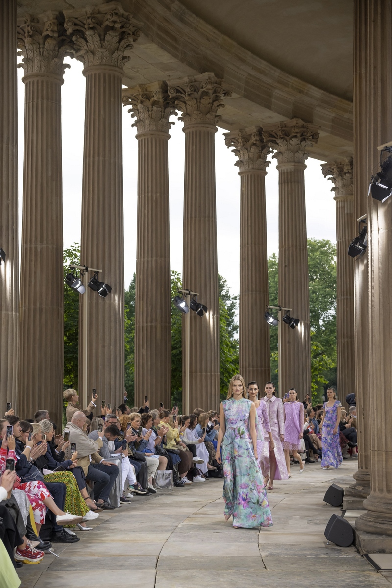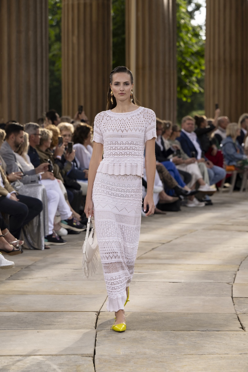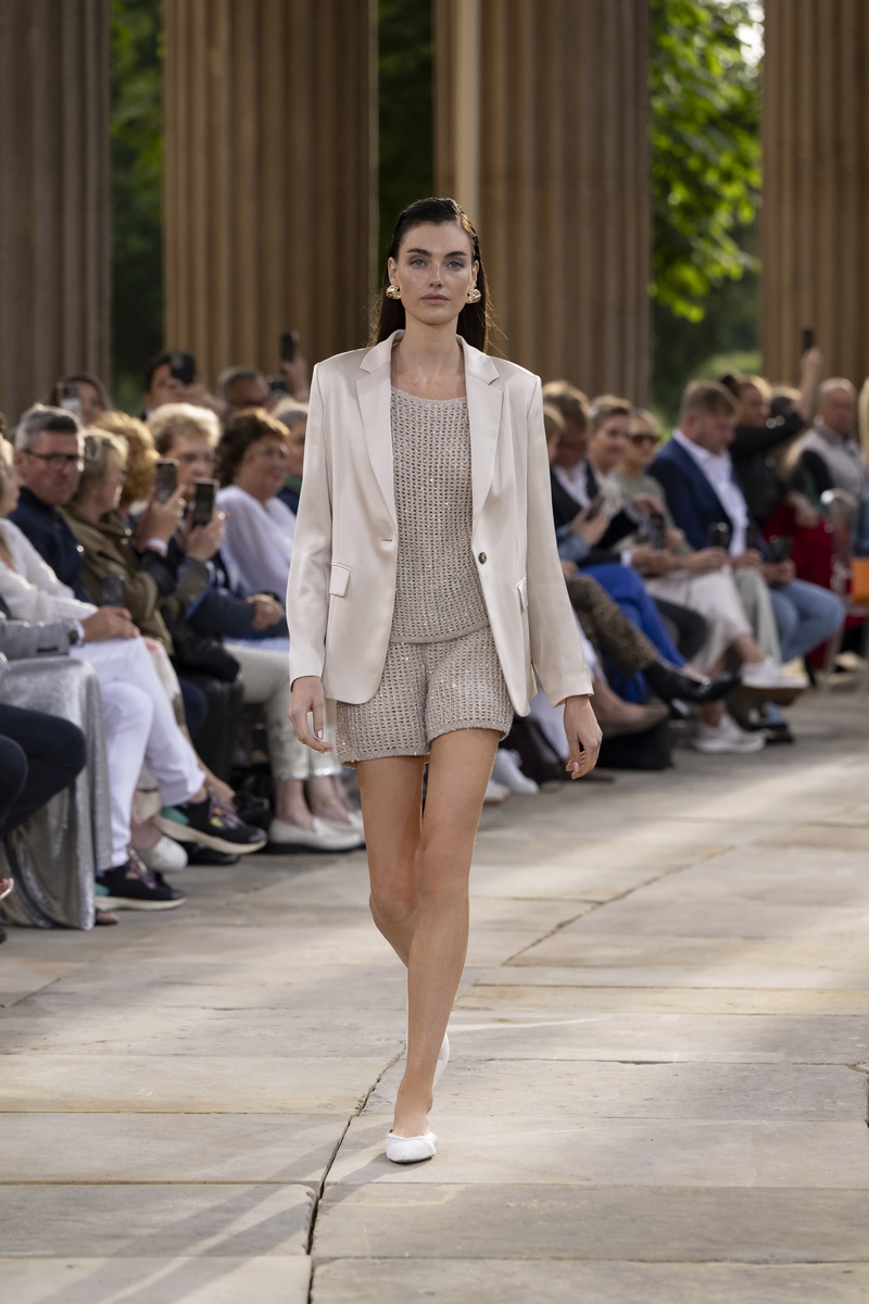 To the atmospheric sounds of modern interpretations of classical music, the models took to the catwalk in the over 100-meter-long colonnades. The looks skilfully combined the various Marc Cain labels and impressively showcasing the brand’s diversity. Knitwear is at the heart of Marc Cain and the focus was on airy summer knitwear, shorts and miniskirts in bouclé, with textured surfaces, lace and lace patterns. Numerous pieces were Knitted in Germany“ and are produced in the fashion company’s own knitting facilities. The colo ur palette commenced with soft beige, light yellow and rosé nuances and moved on to bold blue, red and orange tones. In keeping with the ambience and motto of the evening, Marc Cain opted for „Loud“ instead of „Quiet Luxury“: satin looks, sequins and lurex provided an extra dose of radiance. For the grand finale, the models showed looks from the new Marc Cain Glam label: first long, sparkling dresses and then outfits with eye -catching floral prints.