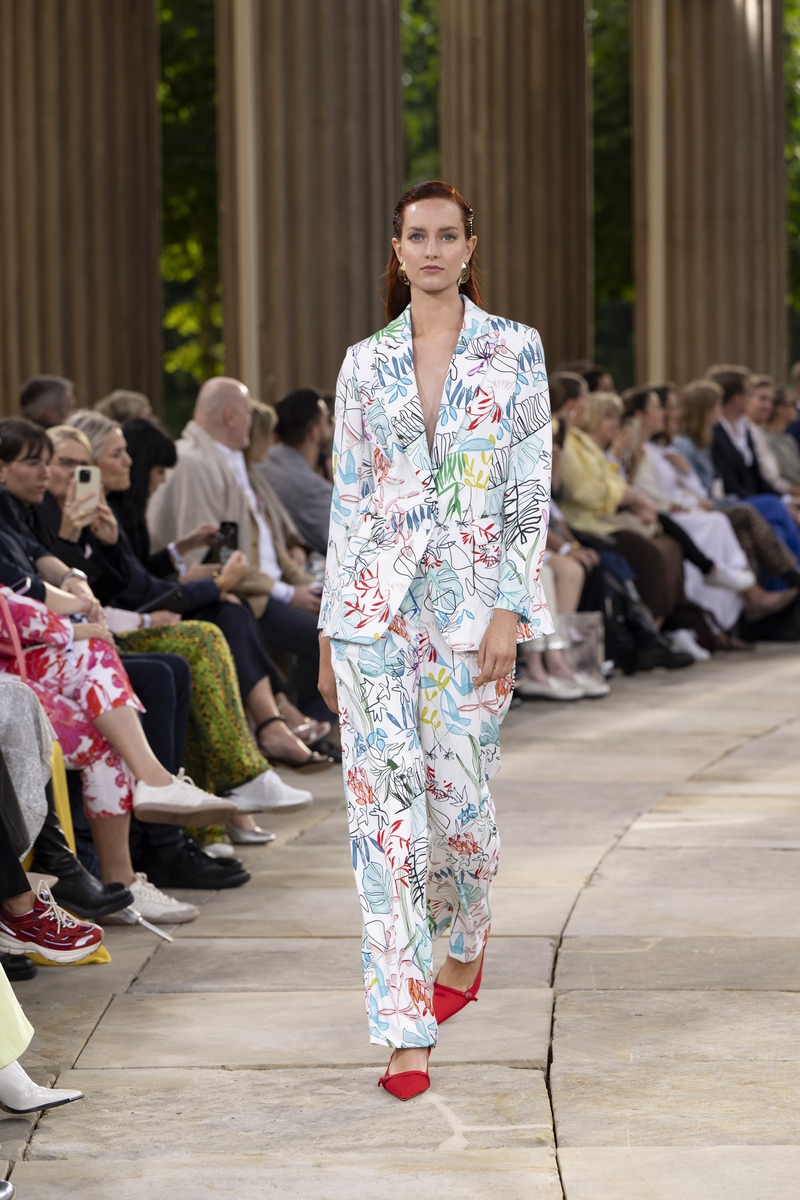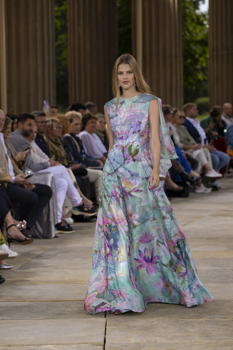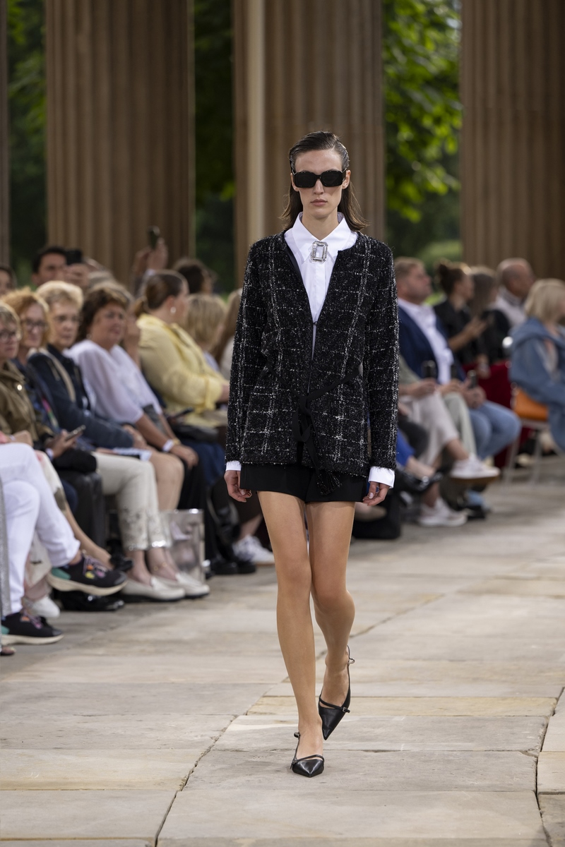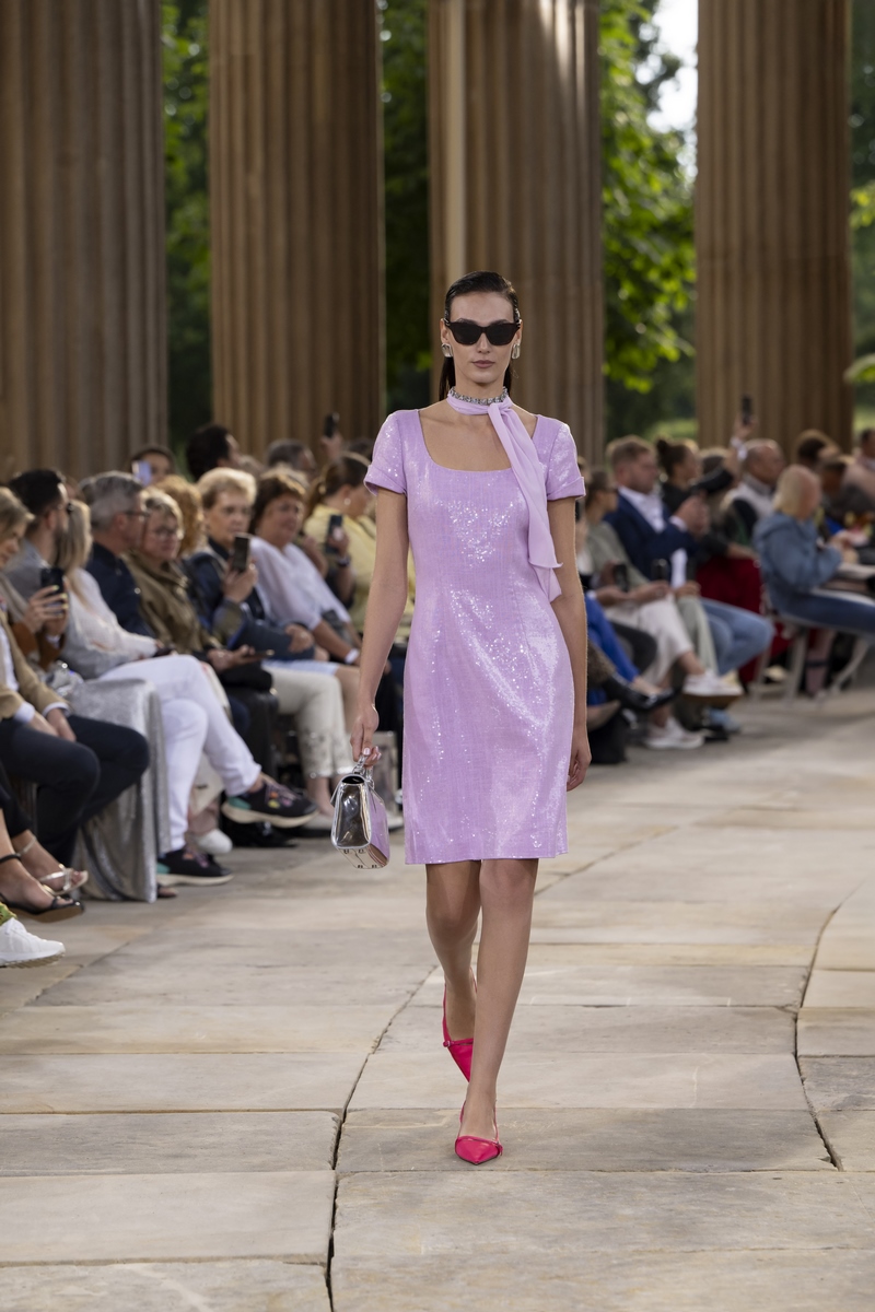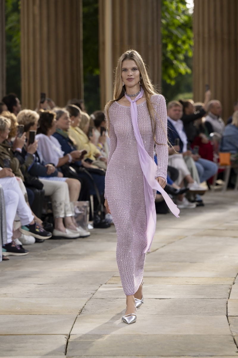 To the atmospheric sounds of modern interpretations of classical music, the models took to the catwalk in the over 100-meter-long colonnades. The looks skilfully combined the various Marc Cain labels and impressively showcasing the brand’s diversity. Knitwear is at the heart of Marc Cain and the focus was on airy summer knitwear, shorts and miniskirts in bouclé, with textured surfaces, lace and lace patterns. Numerous pieces were Knitted in Germany“ and are produced in the fashion company’s own knitting facilities. The colo ur palette commenced with soft beige, light yellow and rosé nuances and moved on to bold blue, red and orange tones. In keeping with the ambience and motto of the evening, Marc Cain opted for „Loud“ instead of „Quiet Luxury“: satin looks, sequins and lurex provided an extra dose of radiance. For the grand finale, the models showed looks from the new Marc Cain Glam label: first long, sparkling dresses and then outfits with eye -catching floral prints.