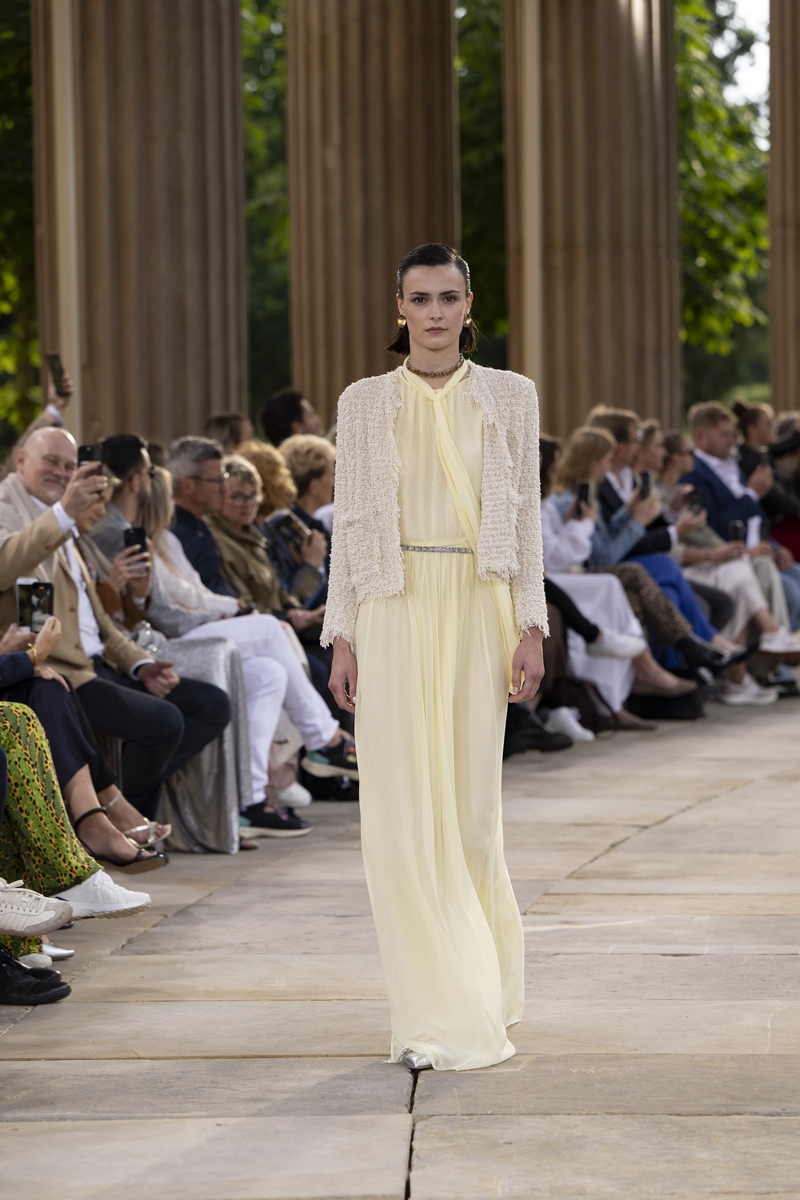 Pure Radiance: Marc Cain presents the new collection in royal location The evening of July 2, 2024, witnessed „Pure Radiance“ in Potsdam: Marc Cain illuminated the Colonnades at the New Palace in Sanssouci Park for its Show as part of Fashion Week Berlin.