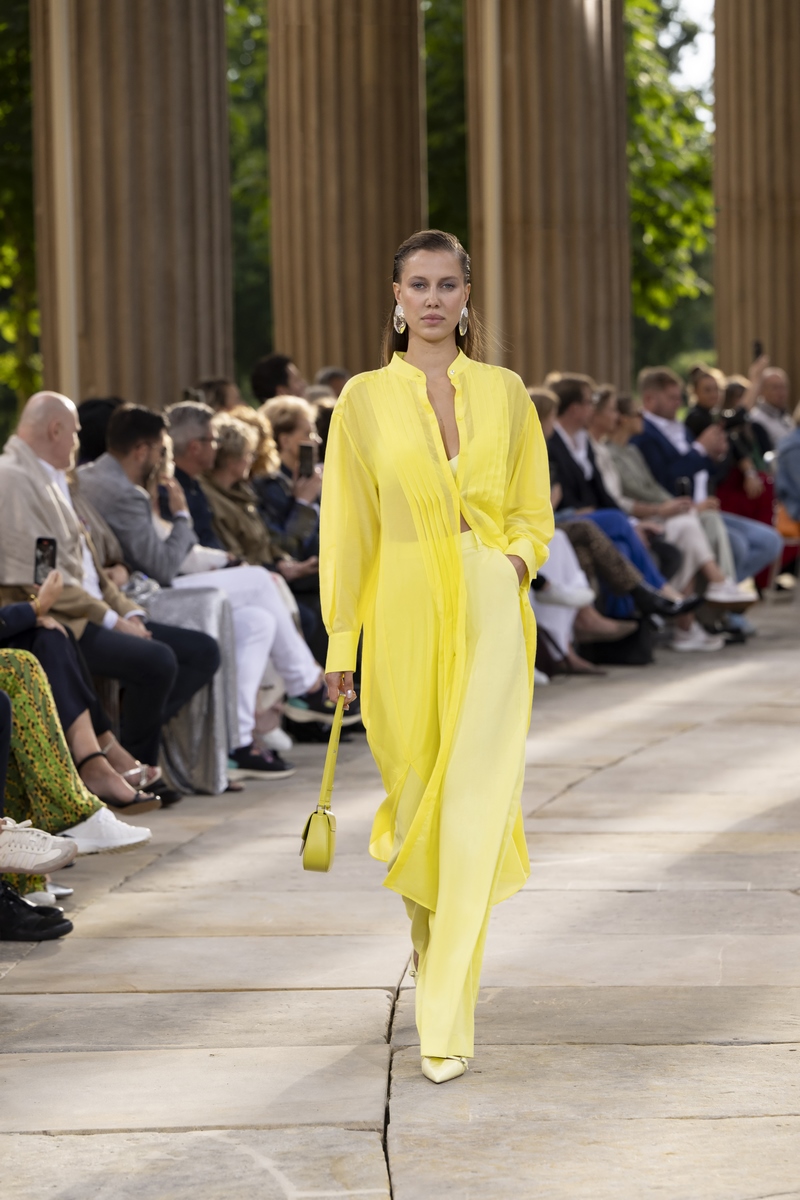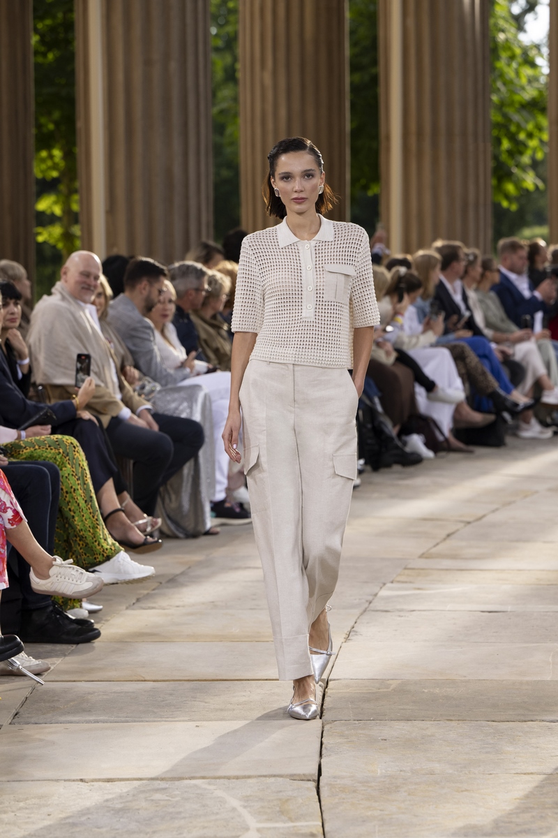 Im Mittelpunkt stand luftiger Sommerstrick, Shorts und Miniröcke, in Bouclé, mit strukturierten Oberflächen, Spitze sowie Lochmuster. Zahlreiche Pieces waren „Knitted in Germany“ und werden im hauseigenen Strickpark des Modeunternehmens gefertigt. Die Farbwelt startete mit sanften Beige-, Hellgelb- sowie Rosé-Nuancen und ging über zu kräftigen Blau-, Rot- und Orange-Tönen.