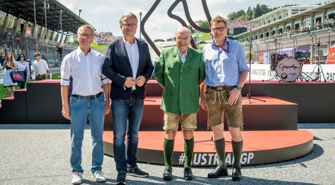 Großes Beitragsfoto: Erich Wolf, GF Projekt Spielberg, LH Christopher Drexler, Carmelo Ezpeleta, Dorna-GF, und Rennsport-Manager von Red Bull Thomas Überall. (Foto Land Steiermark / Brand Images)