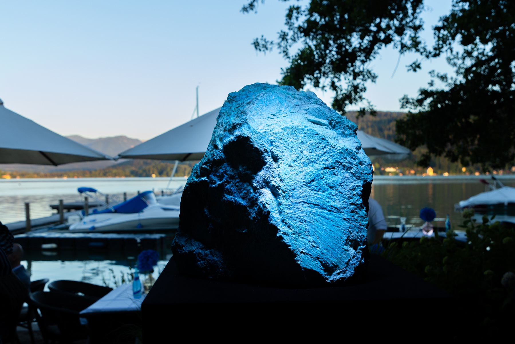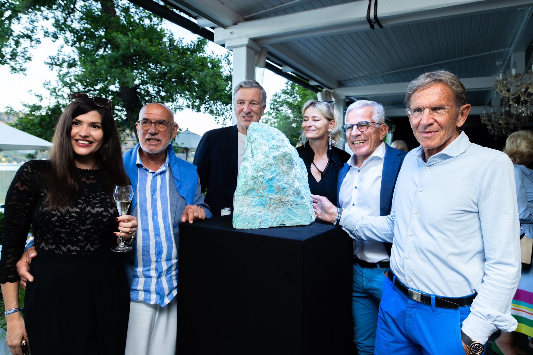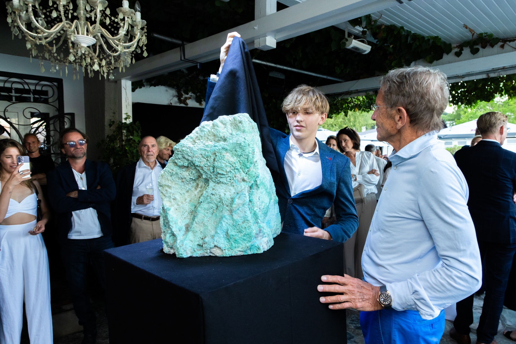 Wem es gelang, trocken durch eine spektakuläre Wasserwand einzutreten, wurde mit Schullini-Cocktail, Canapés und einer überraschenden Enthüllung belohnt: Zu diesem Anlass war es gelungen, den weltgrößten Türkis nach Österreich zu holen.