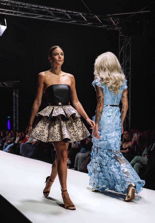 Ein weiteres besonderes Ereignis war der Auftritt der Dragqueen Miss Gloria, die in zwei speziell angefertigten Kreationen den Laufsteg betrat. Zunächst präsentierte sie ein Pride-Kleid aus veganem Lederimitat in den Farben der Transgender-Flagge – ein kraftvolles Statement für Vielfalt und Inklusion. Später bezauberte sie das Publikum in einem bodenlangen Couture-Kleid aus eisblauer Spitze, das bereits bei der Eröffnung von ELITE-Chefredakteurin Ekaterina Mucha getragen wurde und für Aufsehen sorgte.