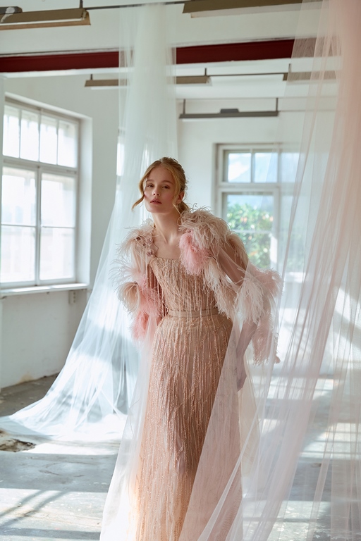 Die Farbpalette der Kollektion spiegelt diese träumerische Reise in die Vergangenheit wider. Zarte Pastelltöne und verspielte Akzente treffen auf sanfte Kontraste, die den Entwürfen eine verträumte und poetische Ästhetik verleihen. Die Kombination aus zarter Stickerei, feinen Federn und detailverliebten Applikationen unterstreicht den aufwendigen Stil und die Liebe zum Detail, die Poleschinski auszeichnet.