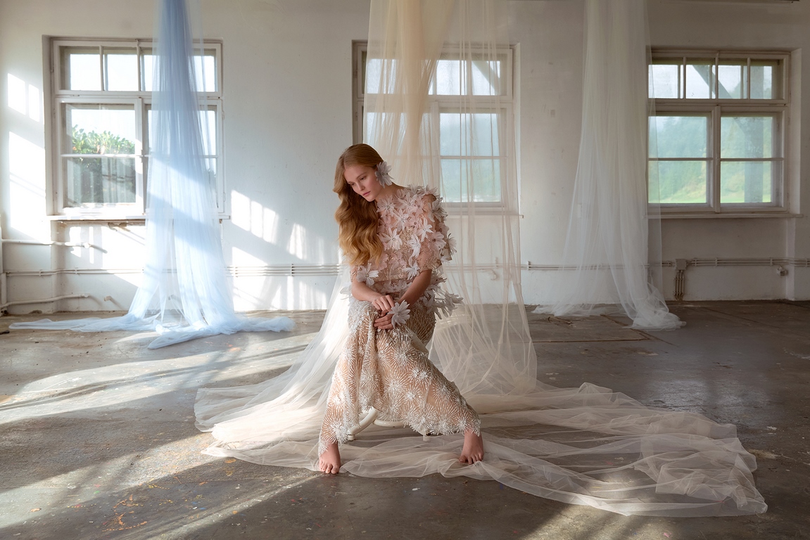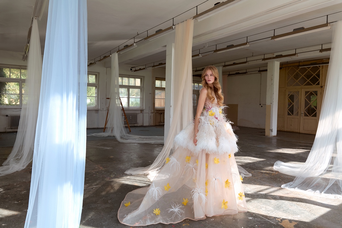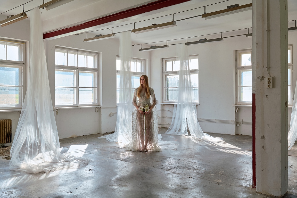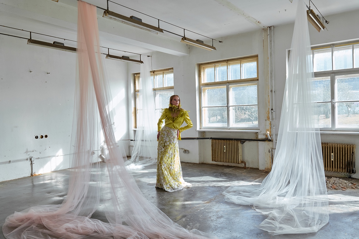 Eva Poleschinski hat die Fotostrecke persönlich fotografiert und dabei die endlos langen Tüllbahnen geschickt in Szene gesetzt, die die Geschichte und die Atmosphäre der alten Fabrik symbolisieren. Diese Verschmelzung von Mode und Historie lässt die Kollektion gleichzeitig verspielt, verträumt und detailverliebt wirken. Die charakteristischen Merkmale ihrer Designs – aufwendige Bestickungen, Federn und zarte Kontraste – unterstreichen die künstlerische Tiefe und das hohe Niveau der handwerklichen Ausführung.