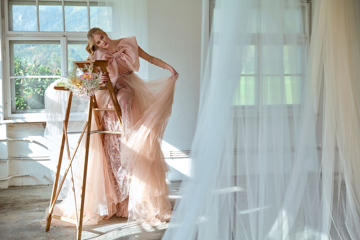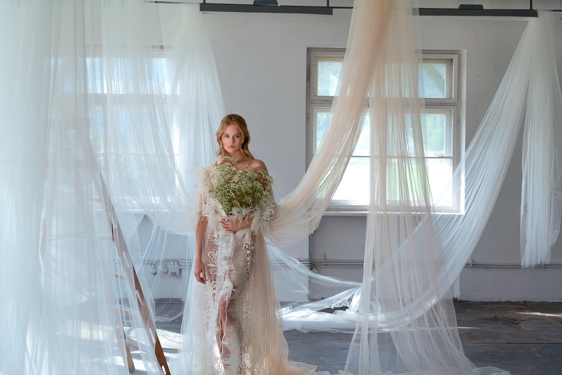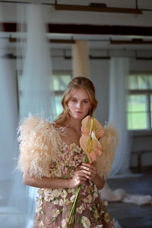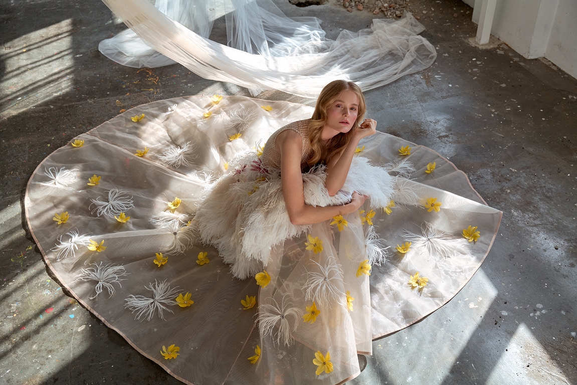 Eva Poleschinski hat die Fotostrecke persönlich fotografiert und dabei die endlos langen Tüllbahnen geschickt in Szene gesetzt, die die Geschichte und die Atmosphäre der alten Fabrik symbolisieren. Diese Verschmelzung von Mode und Historie lässt die Kollektion gleichzeitig verspielt, verträumt und detailverliebt wirken. Die charakteristischen Merkmale ihrer Designs – aufwendige Bestickungen, Federn und zarte Kontraste – unterstreichen die künstlerische Tiefe und das hohe Niveau der handwerklichen Ausführung.