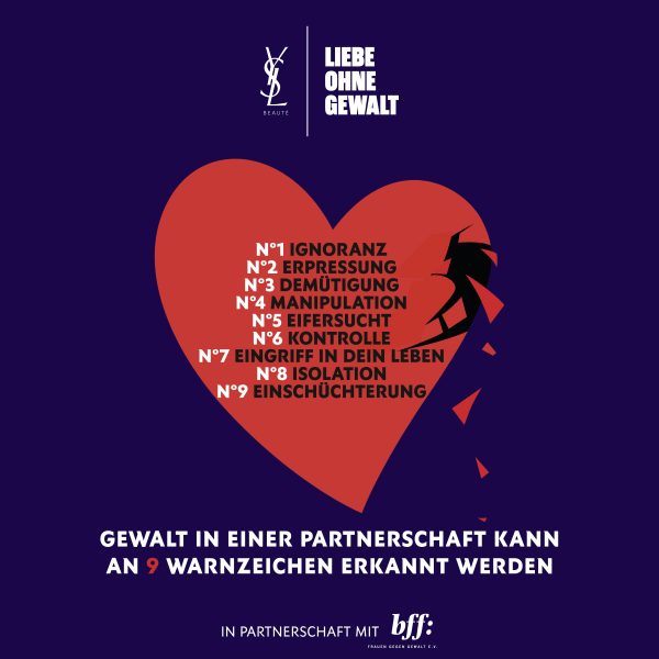Um die Aufmerksamkeit für Gefahren, die von Gewalt in Partnerschaften ausgehen, zu erhöhen und das Bewusstsein für die 9 Warnzeichen zu schärfen, setzt YSL Beauty im Rahmen von ‚Liebe ohne Gewalt‘ auf die Unterstützung lokaler, bekannter Botschafter. Im Rahmen von Videoclips geben diese u.a. reale Erlebnisberichte von Betroffenen wider, die durch den bff bereitgestellt und anonymisiert verwendet wurden. Die Geschichten setzen die Warnzeichen in einen konkreten Kontext und zeigen die Vielschichtigkeit von Gewalt in Partnerschaften auf, die oft zu schwereren Formen der körperlichen, psychischen und sexuellen Gewalt eskaliert. Durch die klare Benennung der Gewalt können Betroffene und auch Außenstehende ein besseres Verständnis für diese Dynamik erlangen. Darüber hinaus werden dem Zuschauer mögliche Kontakte zu lokalen Beratungsstellen an die Hand gegeben.