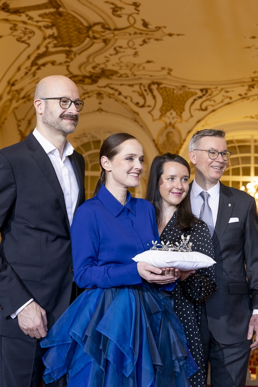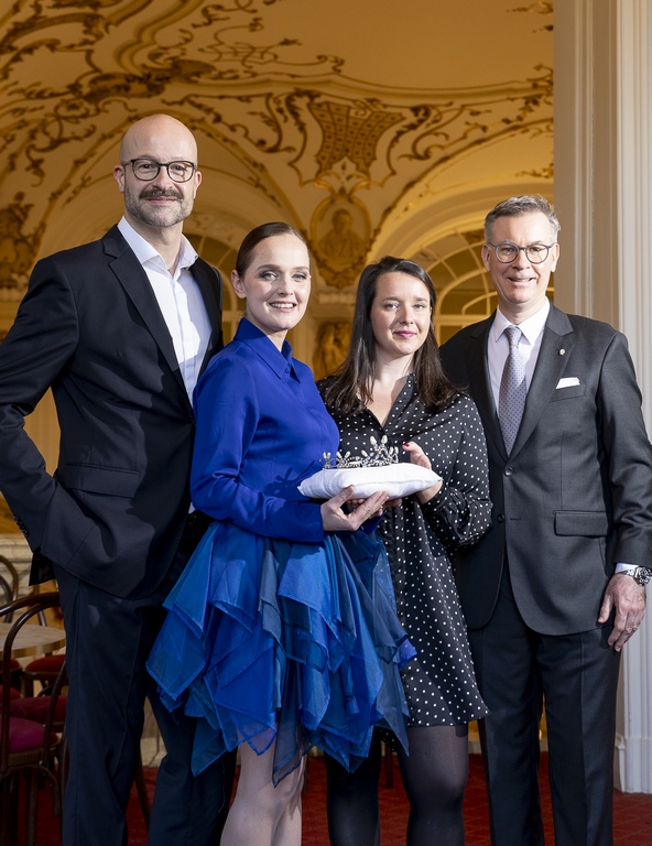 Großes Beitragsfoto: Opernredoute 2025 – Krönchen-Übergabe von Opernredoute-Organisator Bernd Pürcher, Stardesignerin Eva Poleschinski, Projektleiterin Maria Ohrenstein und Juwelier Klaus Weikhard. (Foto Marija Kanizaj)
