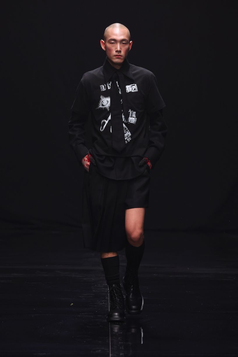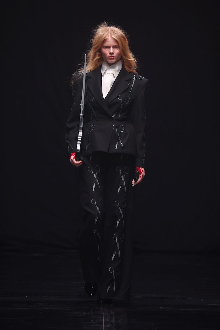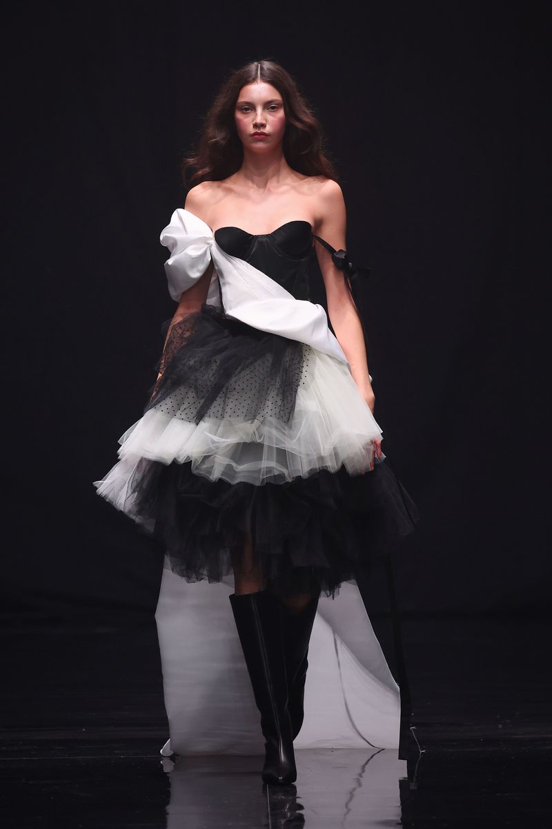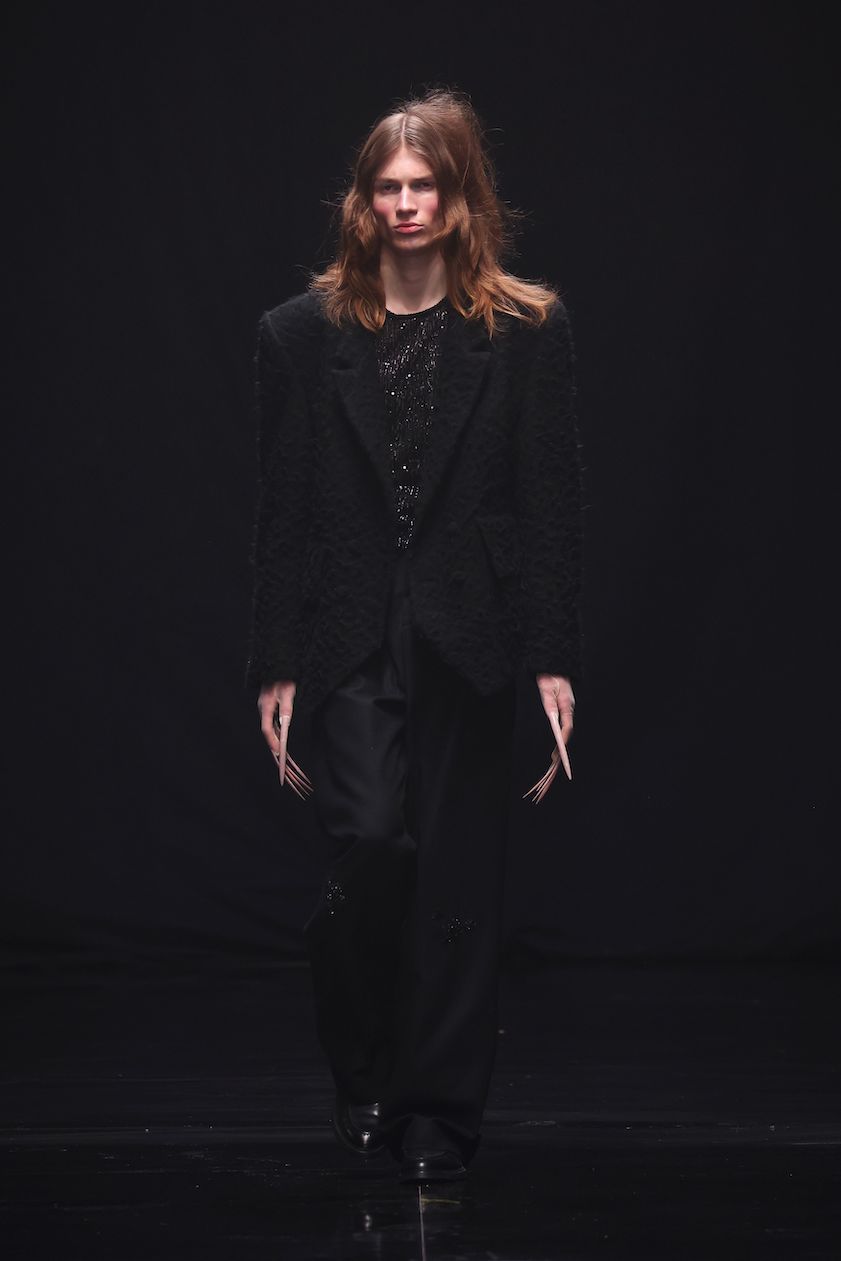 Danny Reinke präsentierte mit seiner neuen Prêt-à-Couture-Kollektion für Herbst/Winter 2025/26 ein Werk, das nicht nur modisch, sondern auch gesellschaftlich Akzente setzt. „90 Seconds to Midnight“ verbindet die düsteren Erzählungen von Heinrich Hoffmanns Struwwelpeter mit der wissenschaftlichen Metapher der Doomsday Clock, ein Symbol für die Wahrscheinlichkeit einer von Menschen verursachten globalen Katastrophe. Diese Weltuntergangsuhr steht aktuell auf nur 90 Sekunden vor Mitternacht. Ein Weckruf, der zu Renitenz, Widerstandskraft und Entschlossenheit mahnt – Haupteigenschaften, die Heinrich Hoffmann seine:n Protagonist:innen zuschreibt – um uns vor der Apokalypse zu bewahren.