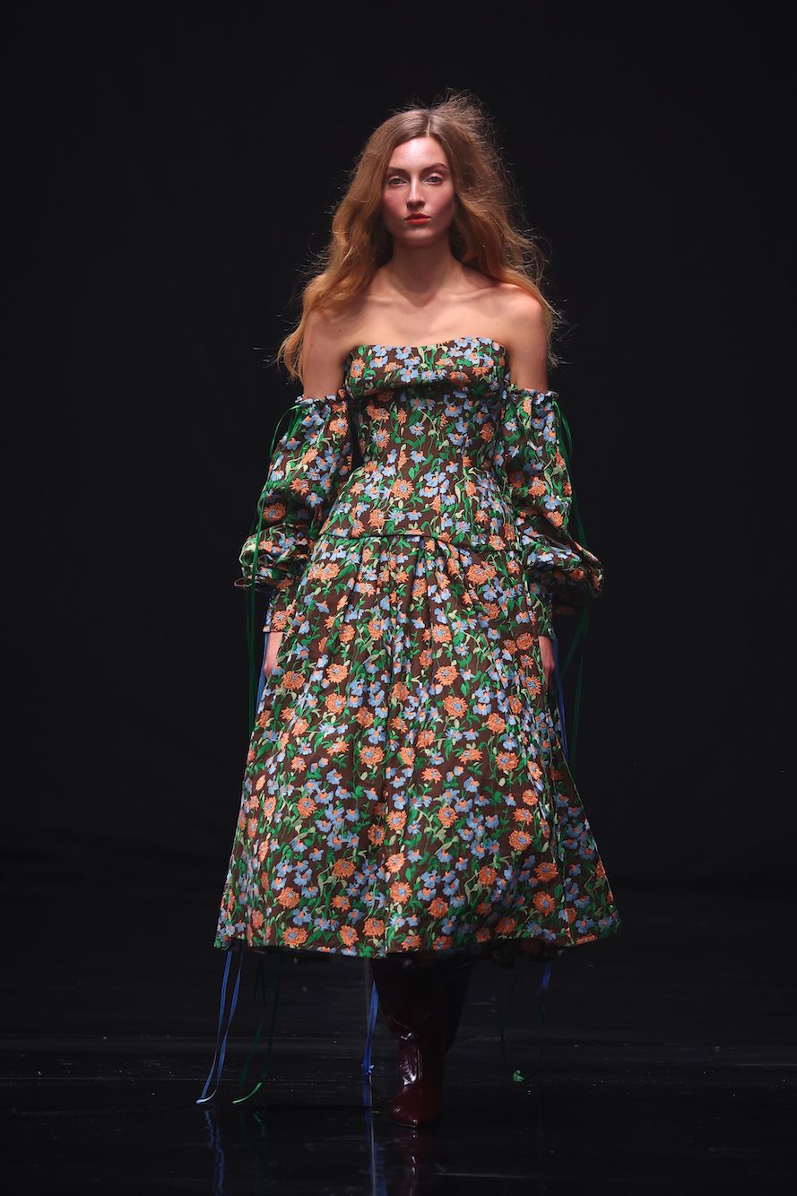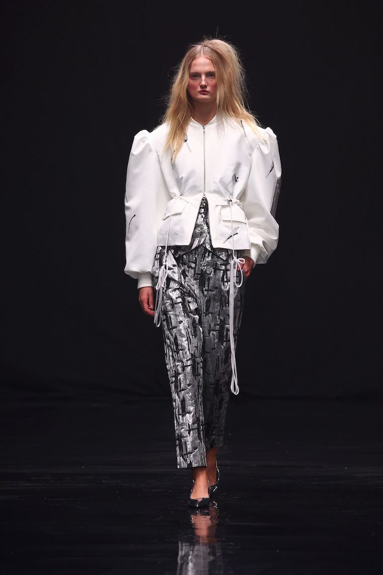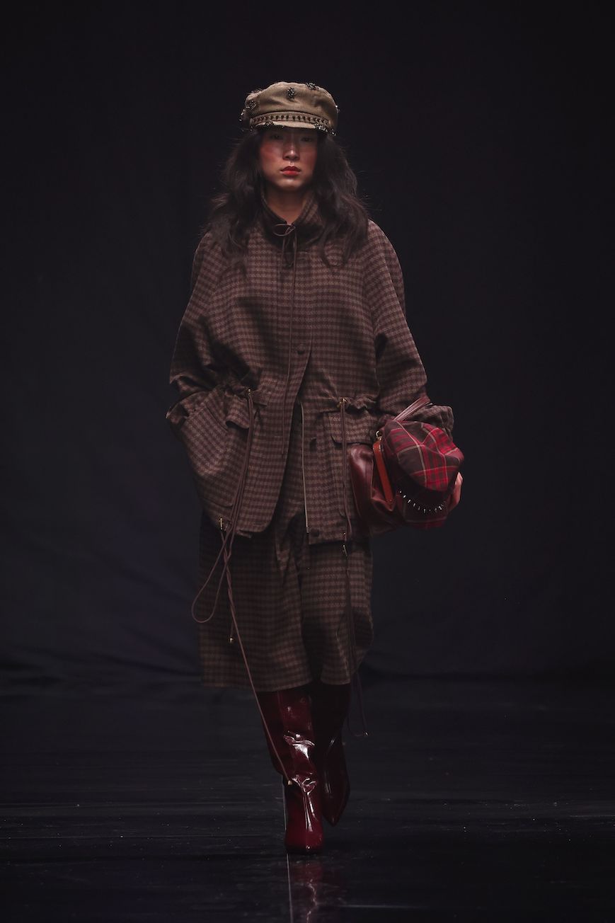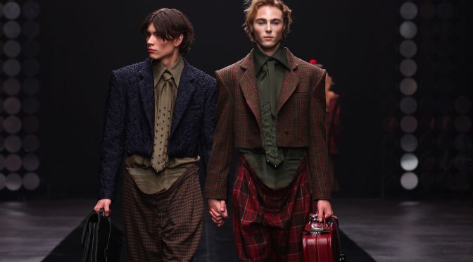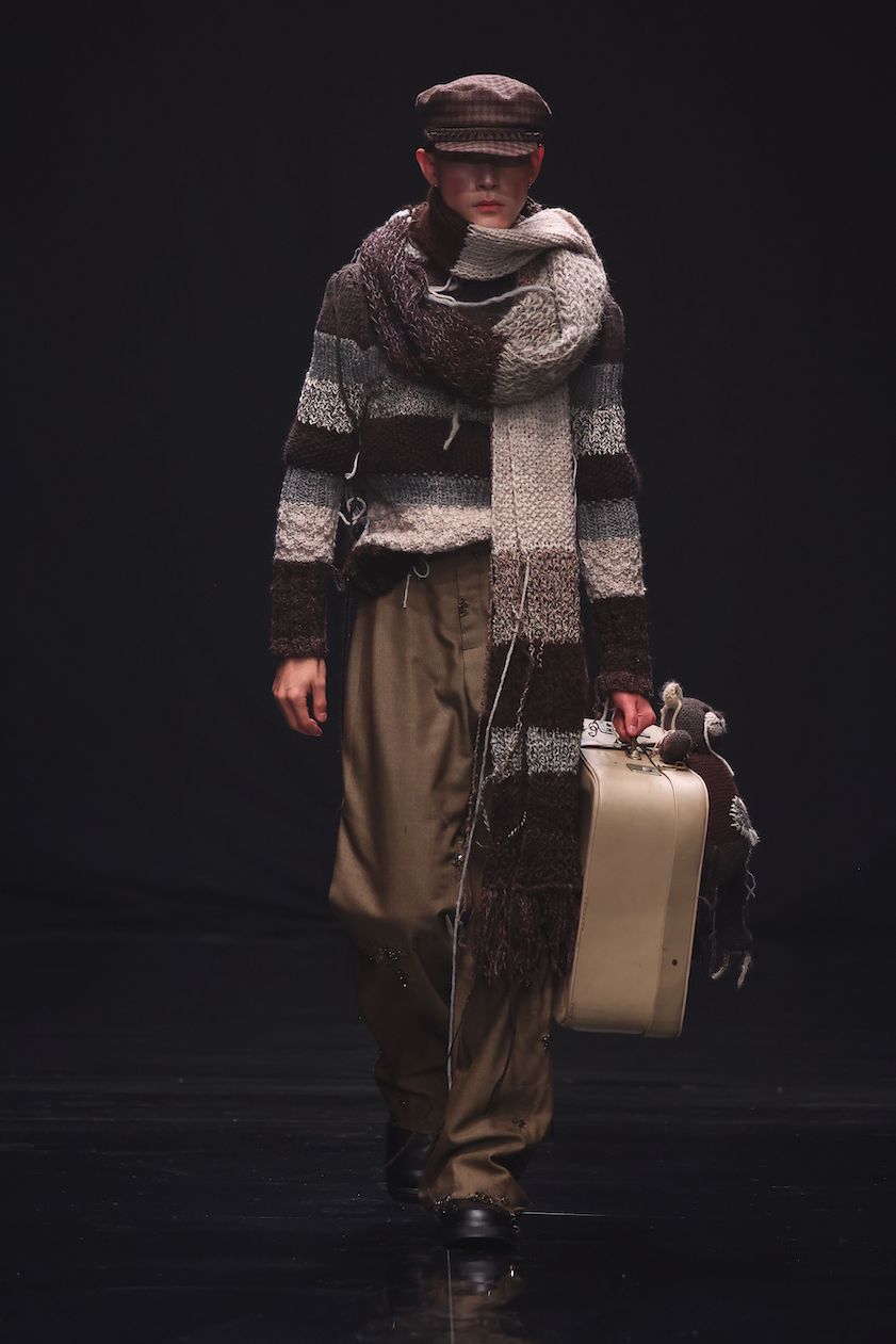 Raffiniert drapierte Abendroben stehen allegorisch für die Eleganz und den Überschwang der Biedermeierzeit, während sie zu einem zerfetzten, zerrissenen Look dekonstruiert werden. Hosen mit doppelten Bündchen wirken, als ob sie, wie gewollt, von der Hüfte zu rutschen drohen und verleihen den Silhouetten eine lässige Nonchalance. Neu interpretierte Punkband-Shirts, kombiniert mit klassischen Kleidungsstücken aus verschiedenartigen Tweed-Stoffen, verleihen der Kollektion eine unkonventionelle, in sich stimmige Dynamik. Ein besonderes Highlight ist der in Zusammenarbeit mit der Textildesignerin Hannah Kaplan entstandene Mantel, der aus sämtlichen Stoffresten der Kollektionsproduktion verfilzt worden ist.