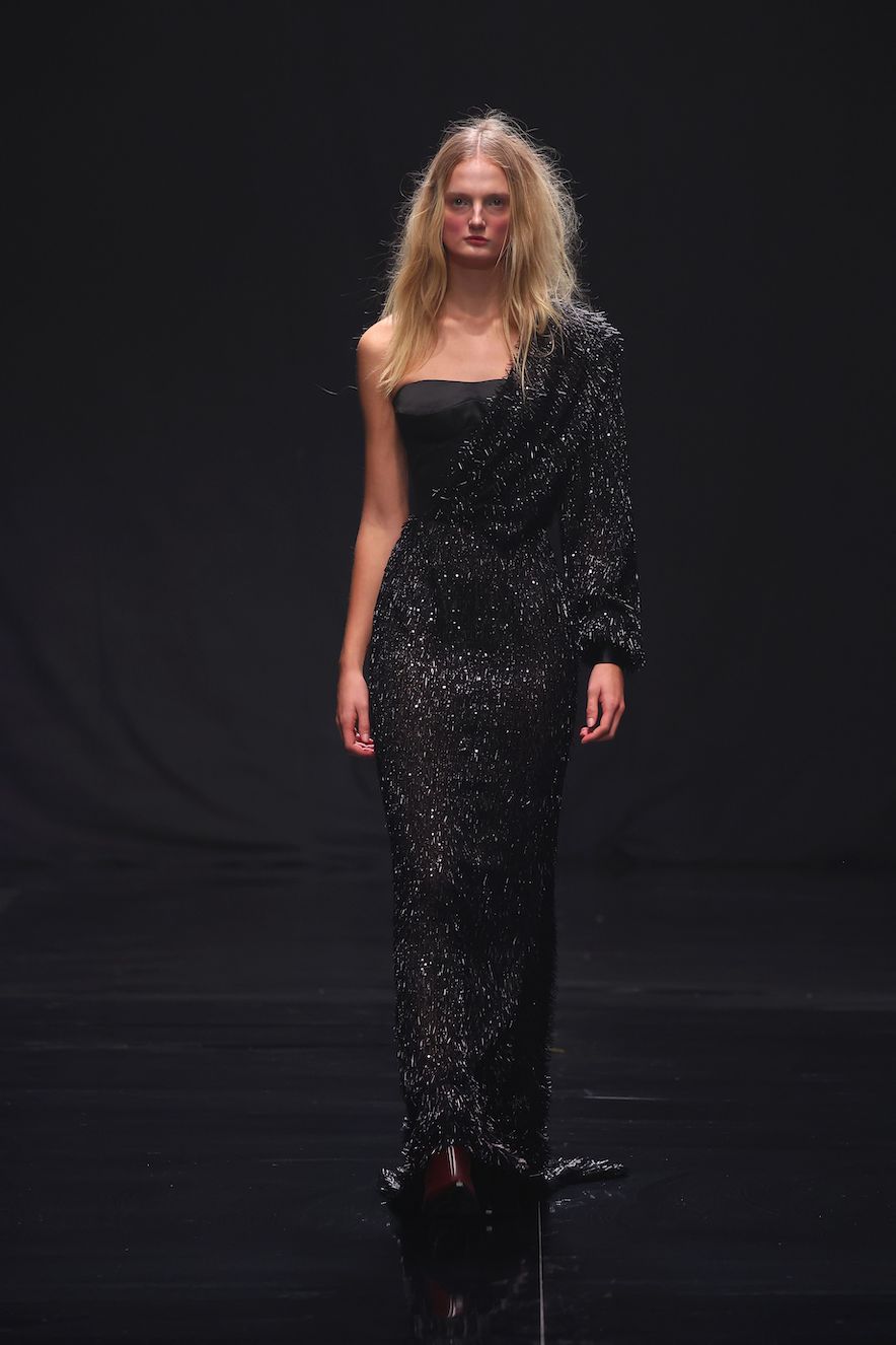 Großes Beitragsfoto: Danny Reinke präsentierte mit seiner neuen Prêt-à-Couture-Kollektion für Herbst/Winter 2025/26 ein Werk, das nicht nur modisch, sondern auch gesellschaftlich Akzente setzt: „90 Seconds to Midnight“. (Photo by Sebastian Reuter/Getty Images for Danny Reinke)