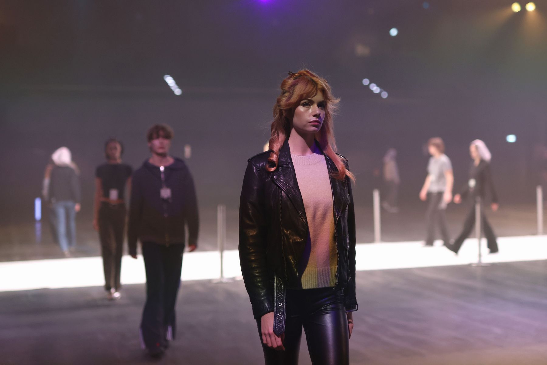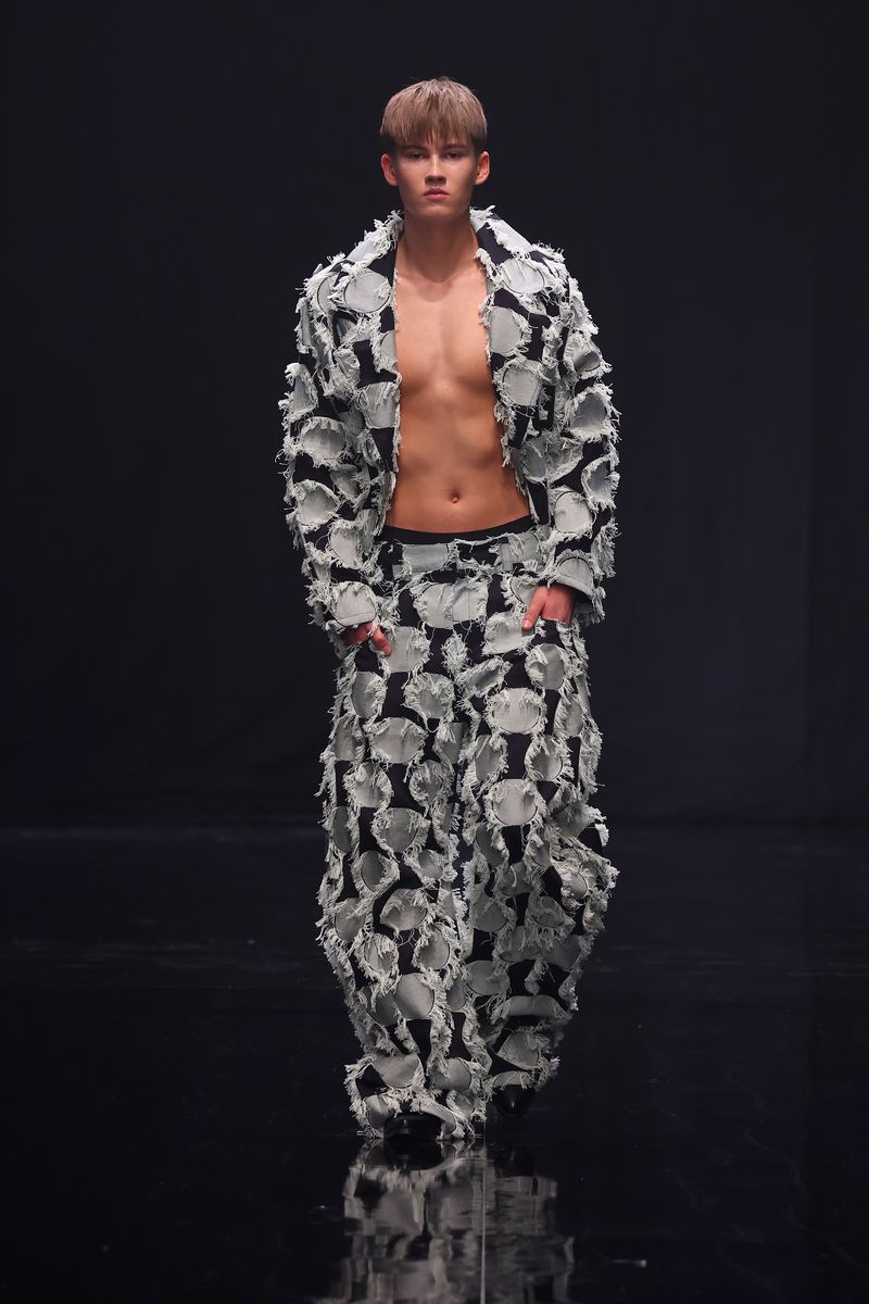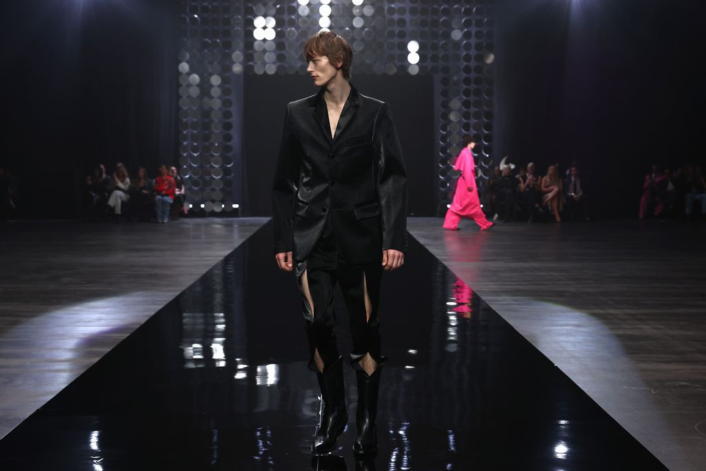 So führt der Designer den Unisex-Gedanken ebenso konsequent weiter wie seine bewussten Stilbrüche: Progressive Daywear trifft auf Glamour und Eveningwear. Pailletten, Glitzer und fließende Satinoptiken kontrastieren mit verspielten Denims. Kräftiges Rosa und Pink wechseln sich ab mit Schwarz und Blau. Styles mit voluminösen Schnitten sorgen für Drama, während Klassiker neu interpretiert werden. Ein schlichter Wollmantel ist mit goldfarbenen Pailletten besetzt.