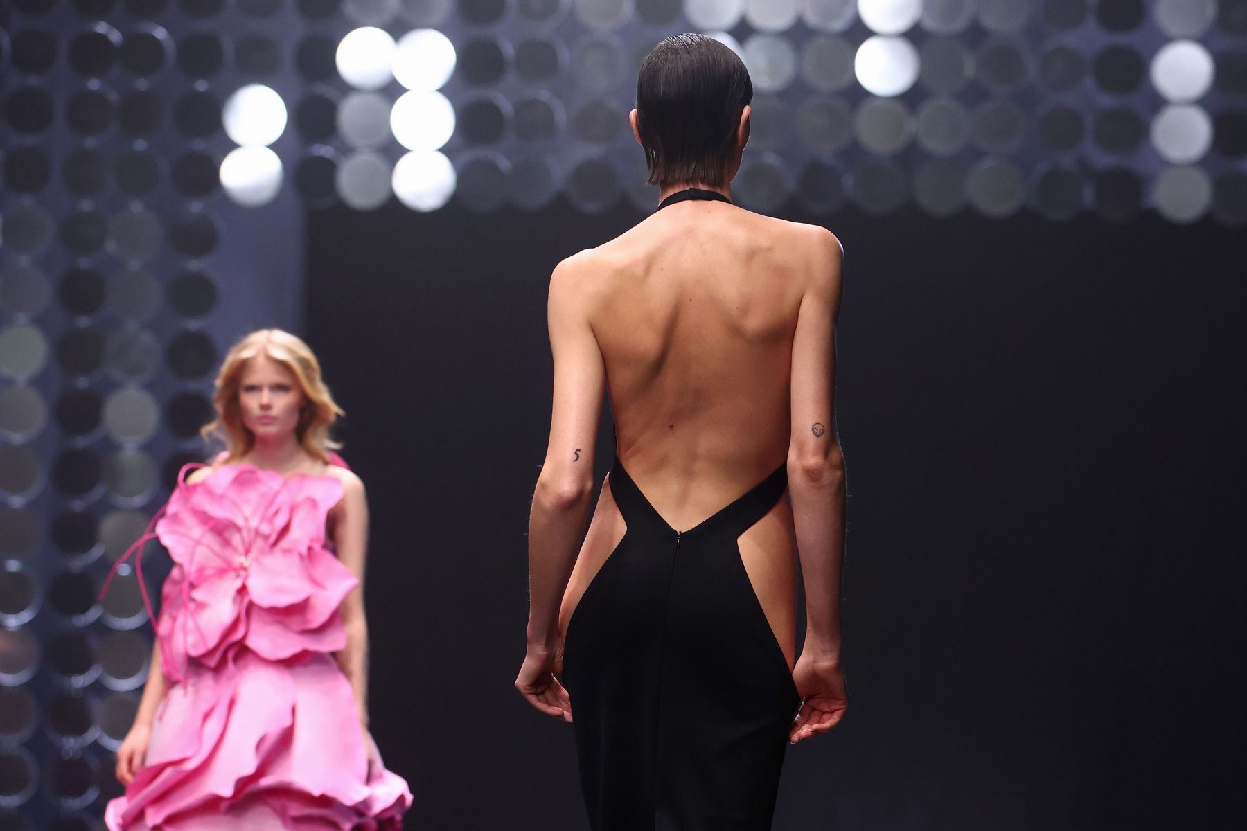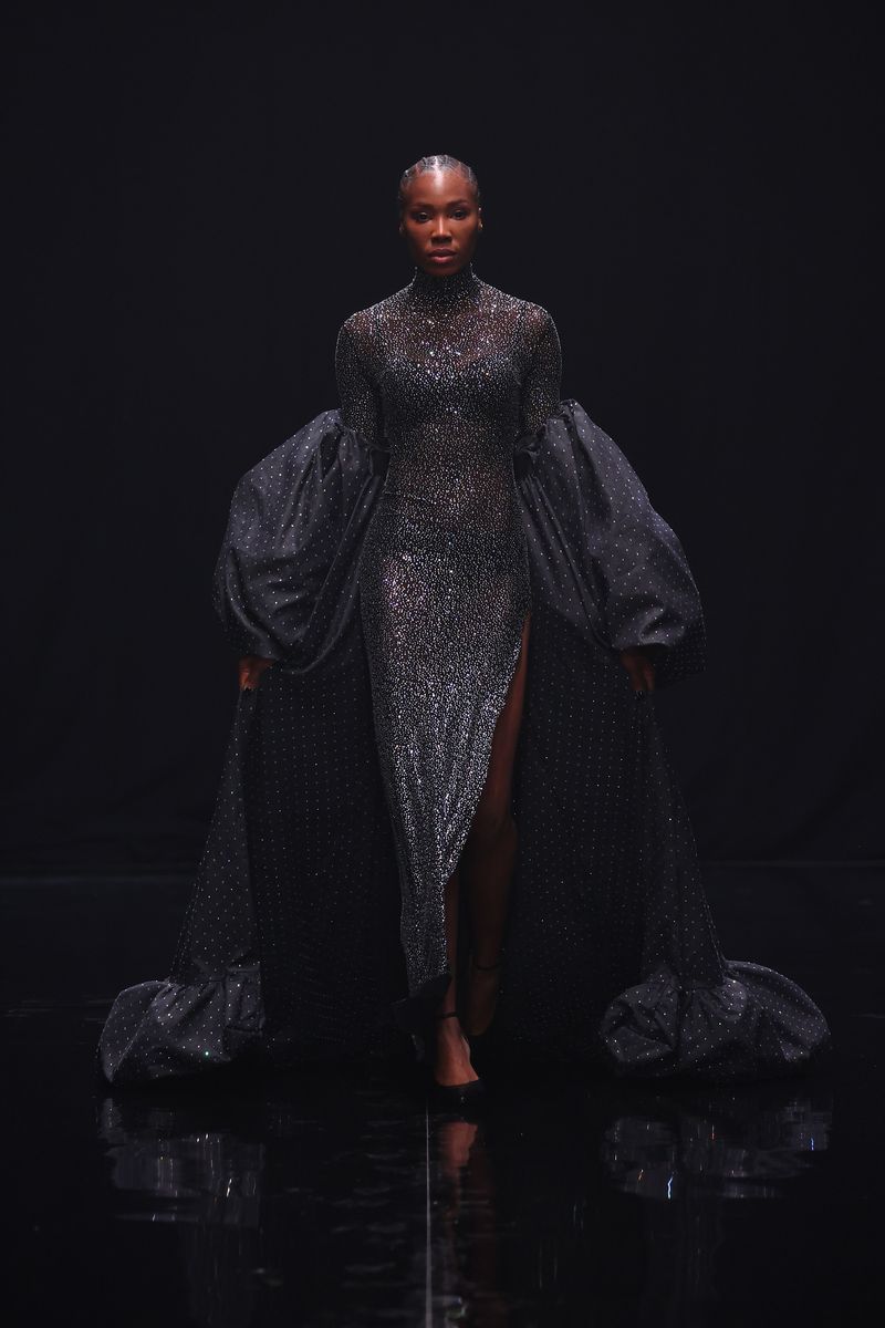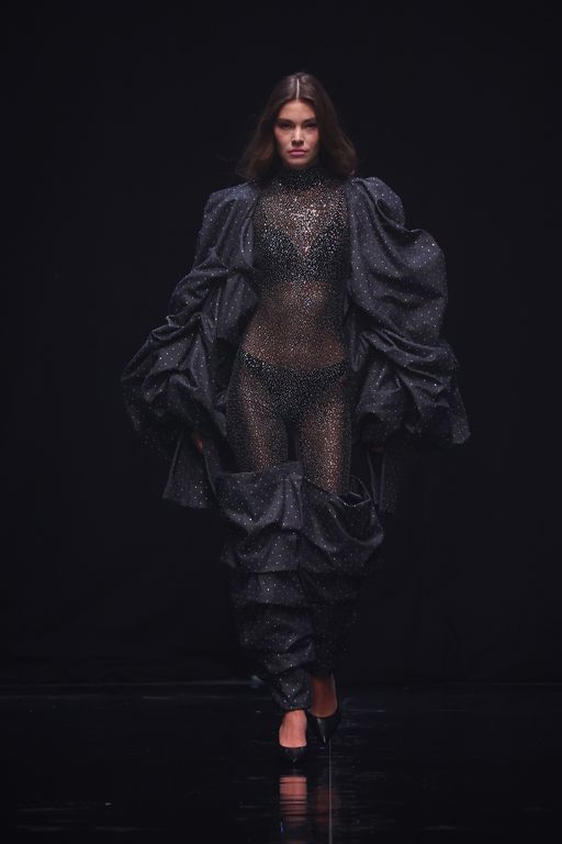 Extragroße Blumen explodieren regelrecht auf den Entwürfen und formen opulente Kleider. Zur Körpermitte hin raffiniert ausgeschnittene Anzüge rücken die Lingerie darunter in den Fokus. Die übergroßen Schnitte und Volumen auf den Schultern spiegeln die Last wider, der ein Shitstorm für einen Menschen bedeuten kann. Der Großteil der Kollektion von Kilian Kerner Berlin besteht auch in dieser Saison aus veganen Stoffen und wird im Nachbarland Polen gefertigt.