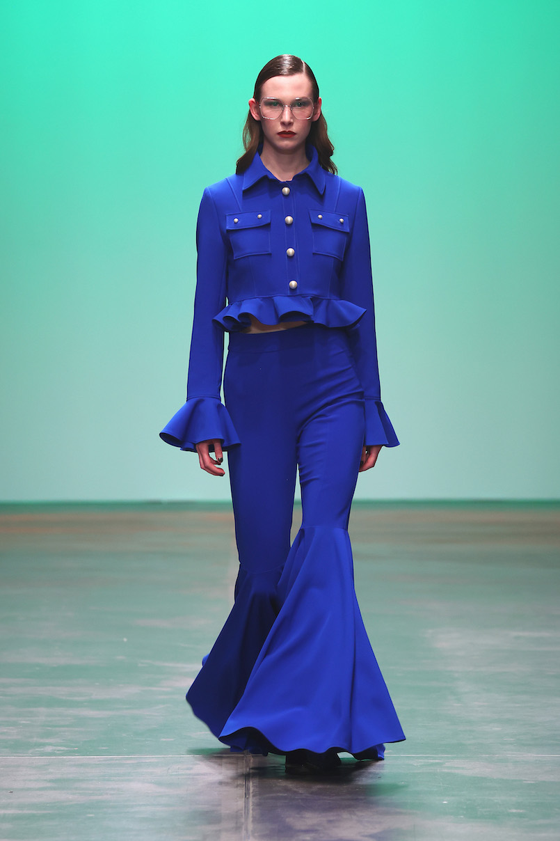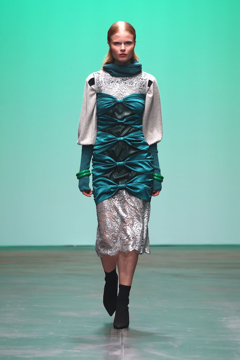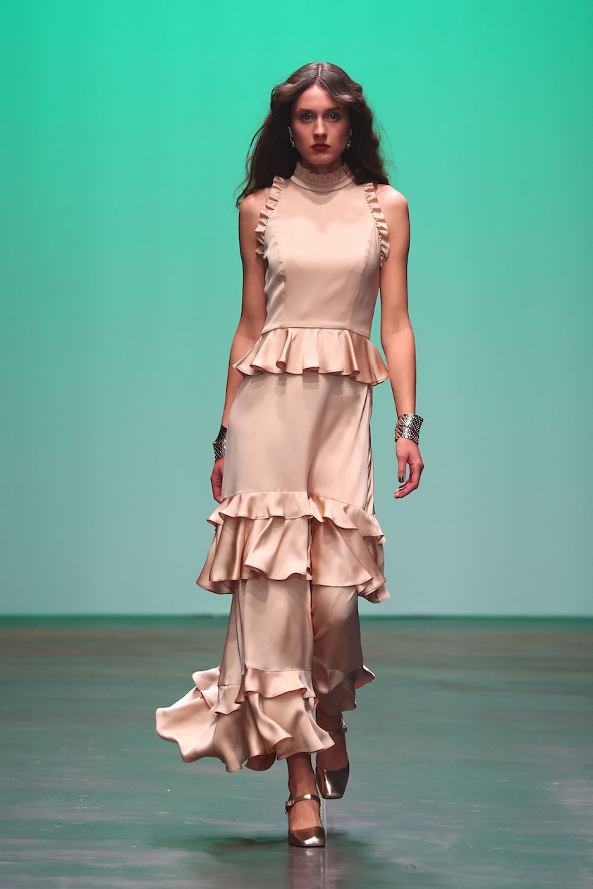 Um den linearen Prints zusätzlich Weichheit, Sinnlichkeit und Sexyness zu verleihen, kombiniert Ostertag die Prints mit opulenten und schwingenden Volants. Der Designer spielt hiermit Farben wie Creme, Orange, Mint, Silber, Grün und Petrol, die die Energie der Nacht in sich tragen, und kombiniert sie mit eleganten Stoffen wie Kunstleder, Seide und edlem Strick. Diese Kreationen – von Cocktail- & Abendkleidern, über Hosenanzüge bis hin zu fließenden Kaftanen – strahlen eine seltene Balance zwischen Luxus und Alltagstauglichkeit aus.