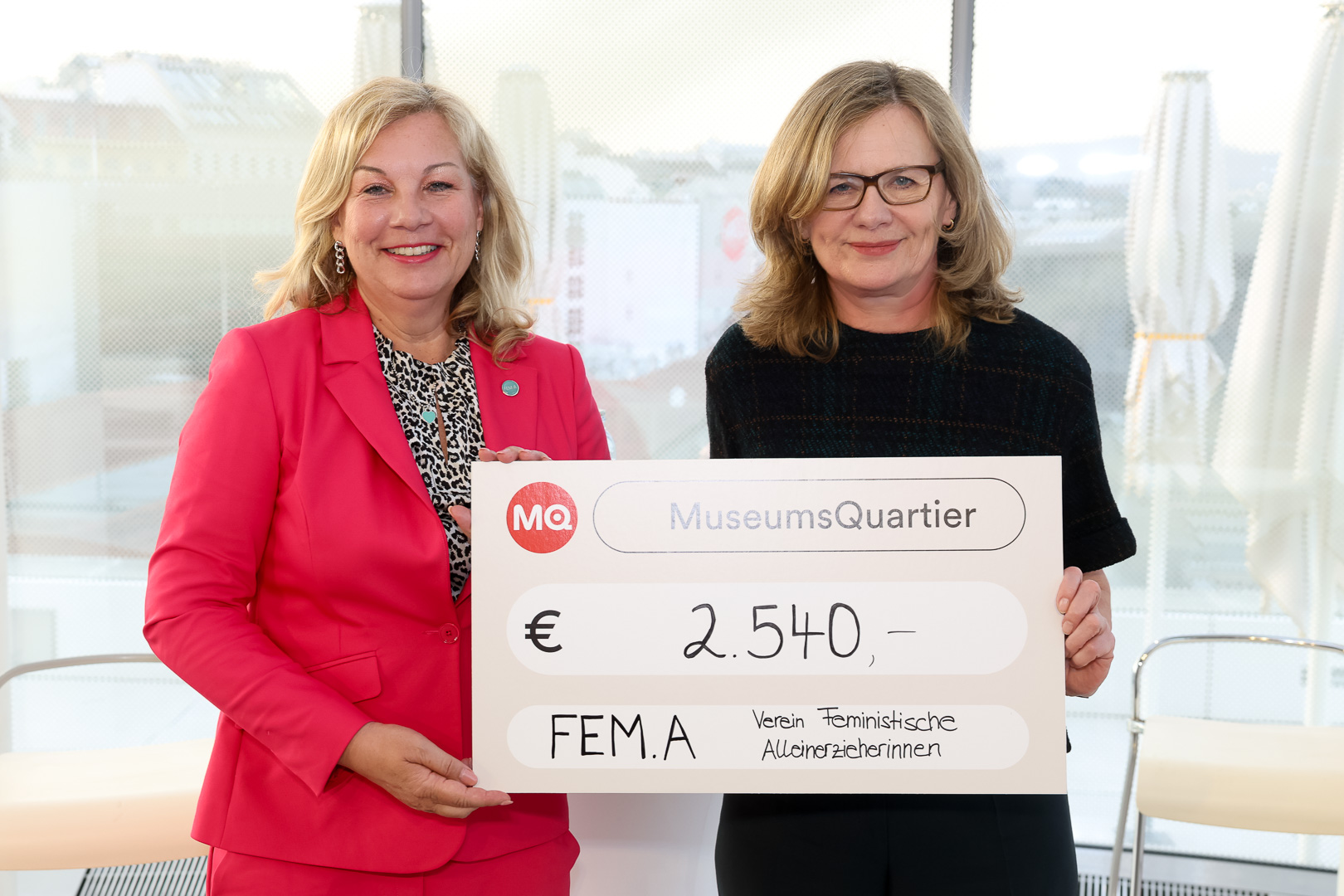 Nach der offiziellen Begrüßung durch MQ Direktorin Bettina Leidl und der Scheckübergabe des Erlöses aus dem MQ Charity-Punsch im Dezember 2024 an die geschäftsführende Obfrau von FEM.A (Verein Feministische Alleinerzieherinnen) folgte eine spannende Diskussionsrunde mit Schauspielerin & Autorin Valerie Huber, Podcasterin & Speakerin Mari Lang (Frauenfragen – der feministische Podcast) sowie MQ Direktorin Bettina Leidl.