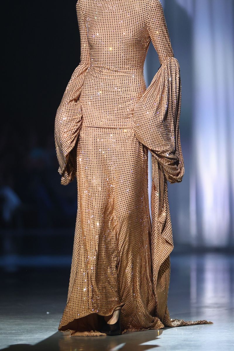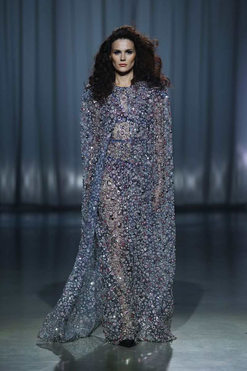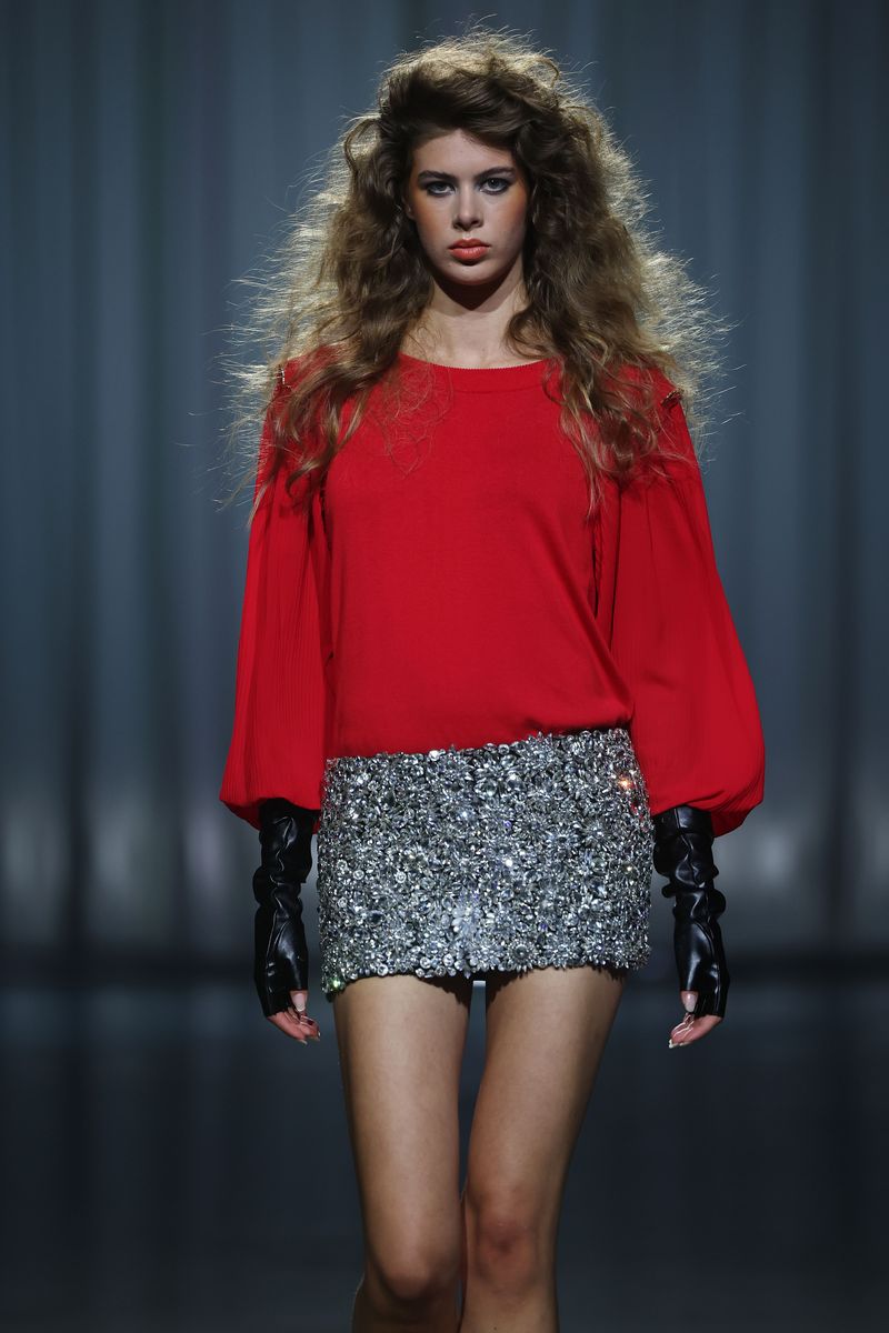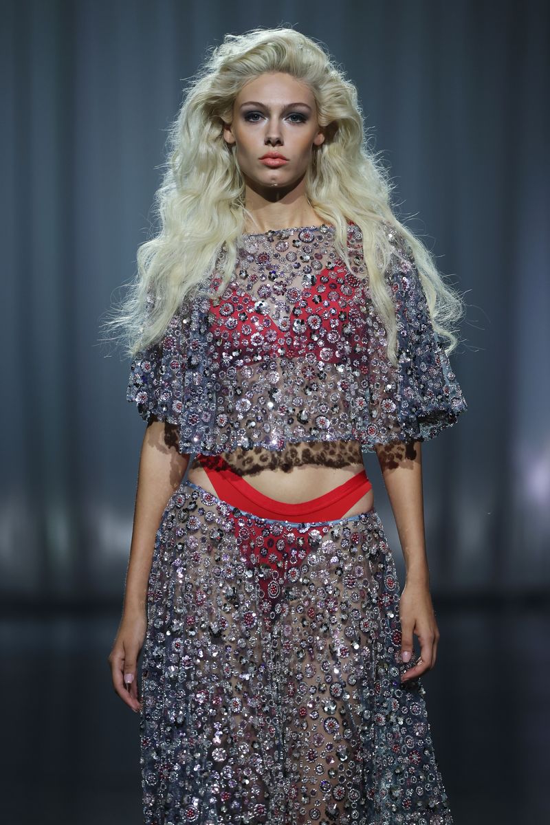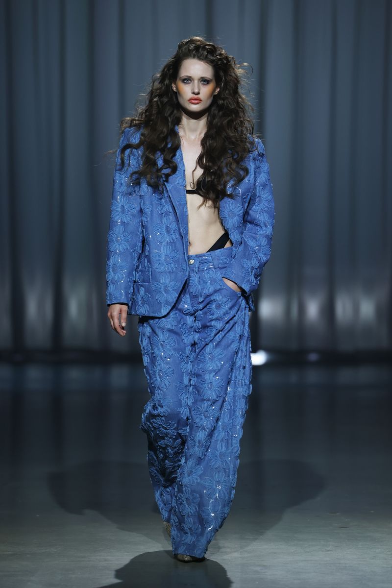 Der Eröffnungslook: ein Midi-Dress mit markanten Schultern, breitem Taillengürtel und spitzen Nieten auf den Knöpfen. Progressive Streetwear-Looks treffen auf Abendlooks, die feminin und sexy daherkommen. Mit Blumen bestickter Denim trifft auf Glitzersteine; an anderer Stelle wird Denim mit Pailletten um Tüll mit Blüten ergänzt – Gänseblümchen sind dabei ein Symbol für die Unschuld und Reinheit der Kinder. Goldenes und schwarzes Kunstleder bringen Härte in die Kollektion. Zerrissener Denim mit Perlen weckt ein Gefühl von Verletzlichkeit.