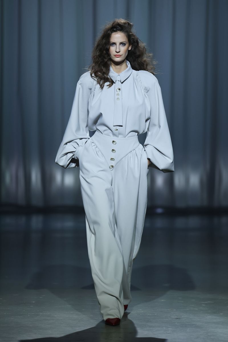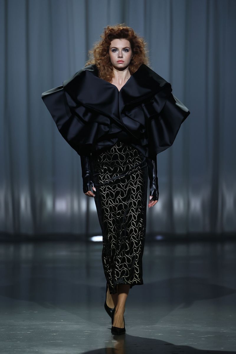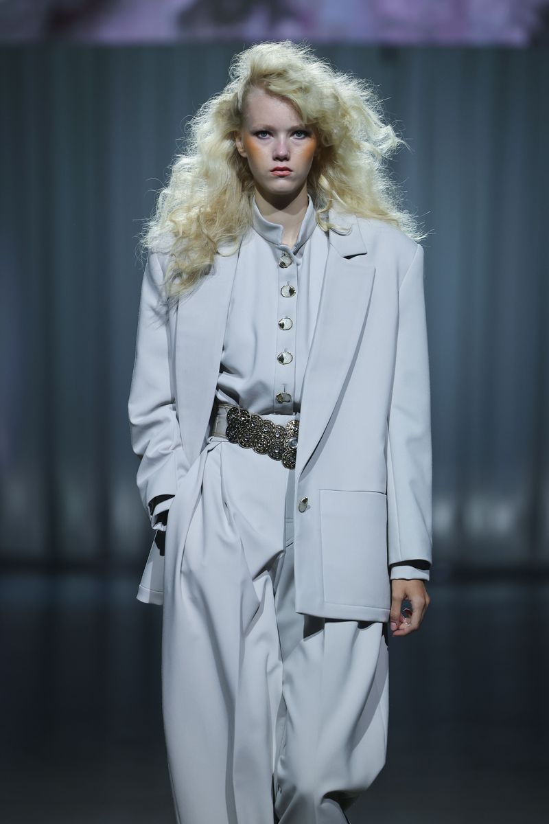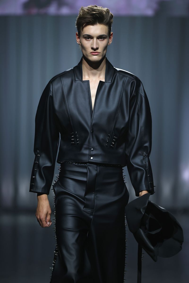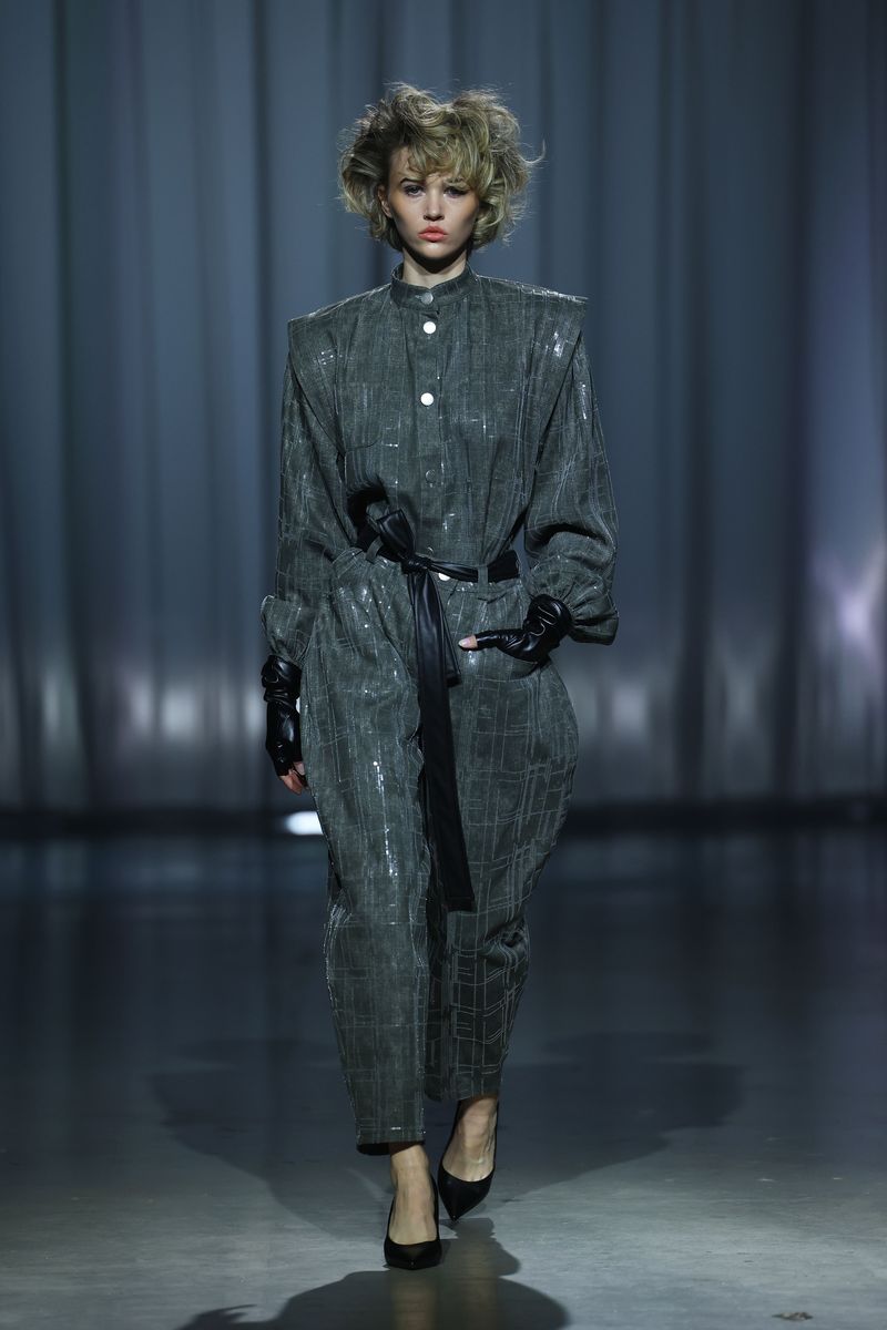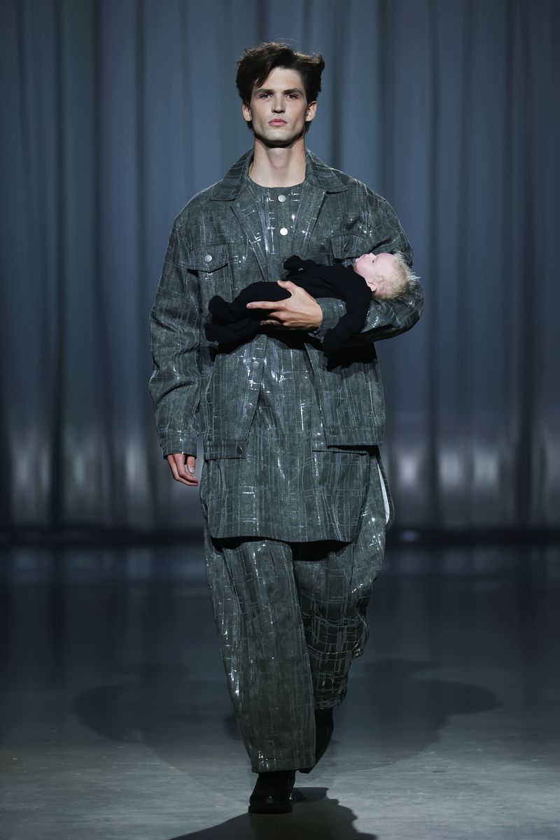 Die neue Kollektion von Kilian Kerner Berlin ist inspiriert durch das Jahrzehnt, in dem die Themen Zwangsadoptionen und angeblicher Kindstod ihre Höhepunkte hatten: die 80er-Jahre. Die typischen expressiven Silhouetten des Jahrzehnts werden dafür modern interpretiert. Hosen und Jacken sind mit Nieten besetzt.