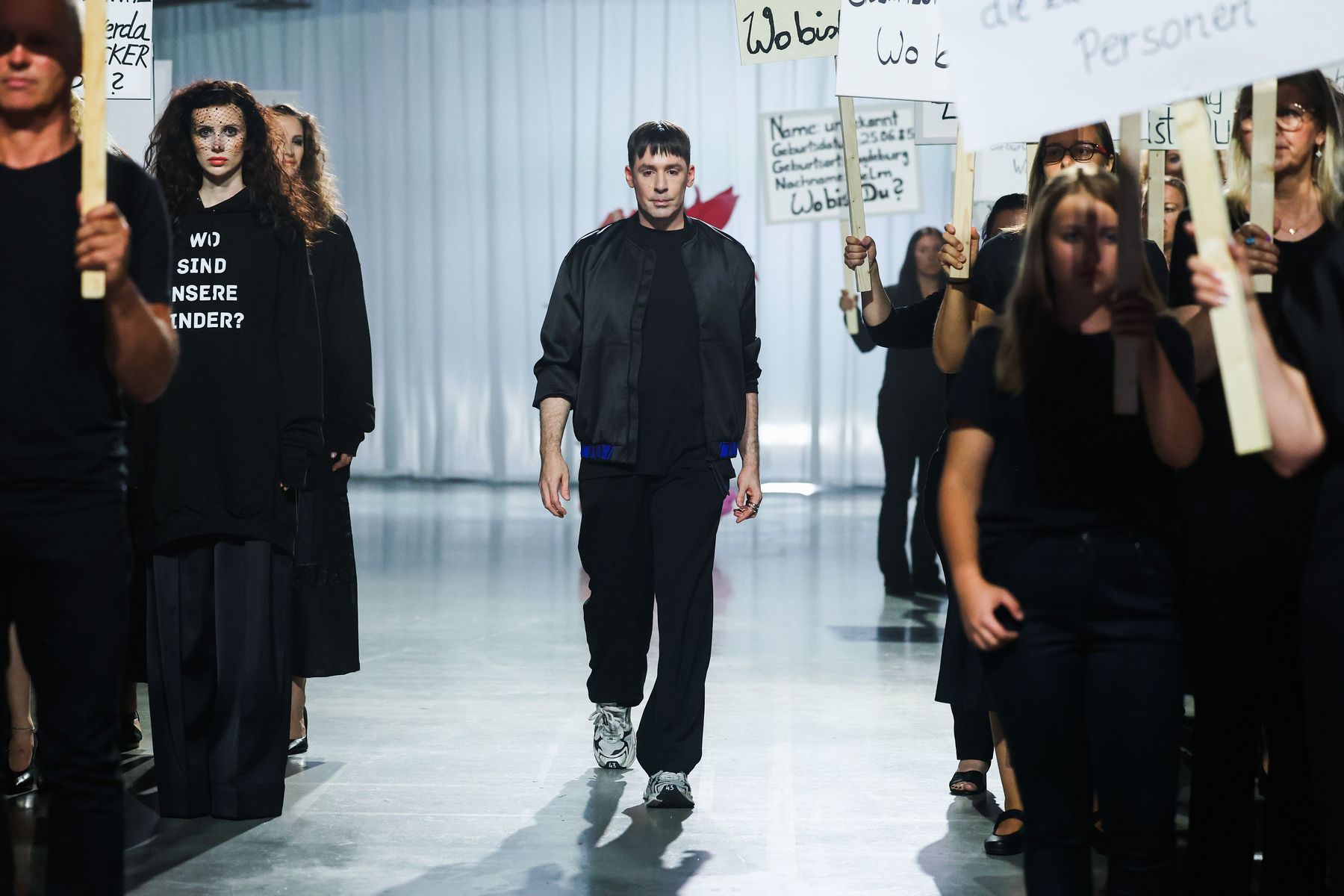 Die Models schritten durch ein Set, das an die Berliner Mauer mit Stacheldraht erinnert. Mit Schattenspielen hinter einem Vorhang und Soldatenpuppen als Reminiszenz an den Osten. Die dramatische Inszenierung der Show erreichte ihren emotionalen Höhepunkt beim Finale: Zum traditionellen Final Walk kamen über 30 betroffene Familienmitglieder von angeblichem Säuglingstod und Zwangsadoption an den Händen der Models mit auf den Runway – sie demonstrierten mit Schildern ihre Forderungen an Zeitzeugen und die Politik. Auf den kubischen Leinwänden in der Uber Arena liefen dazu Filme, in dem Betroffene nach ihren Kindern suchen.