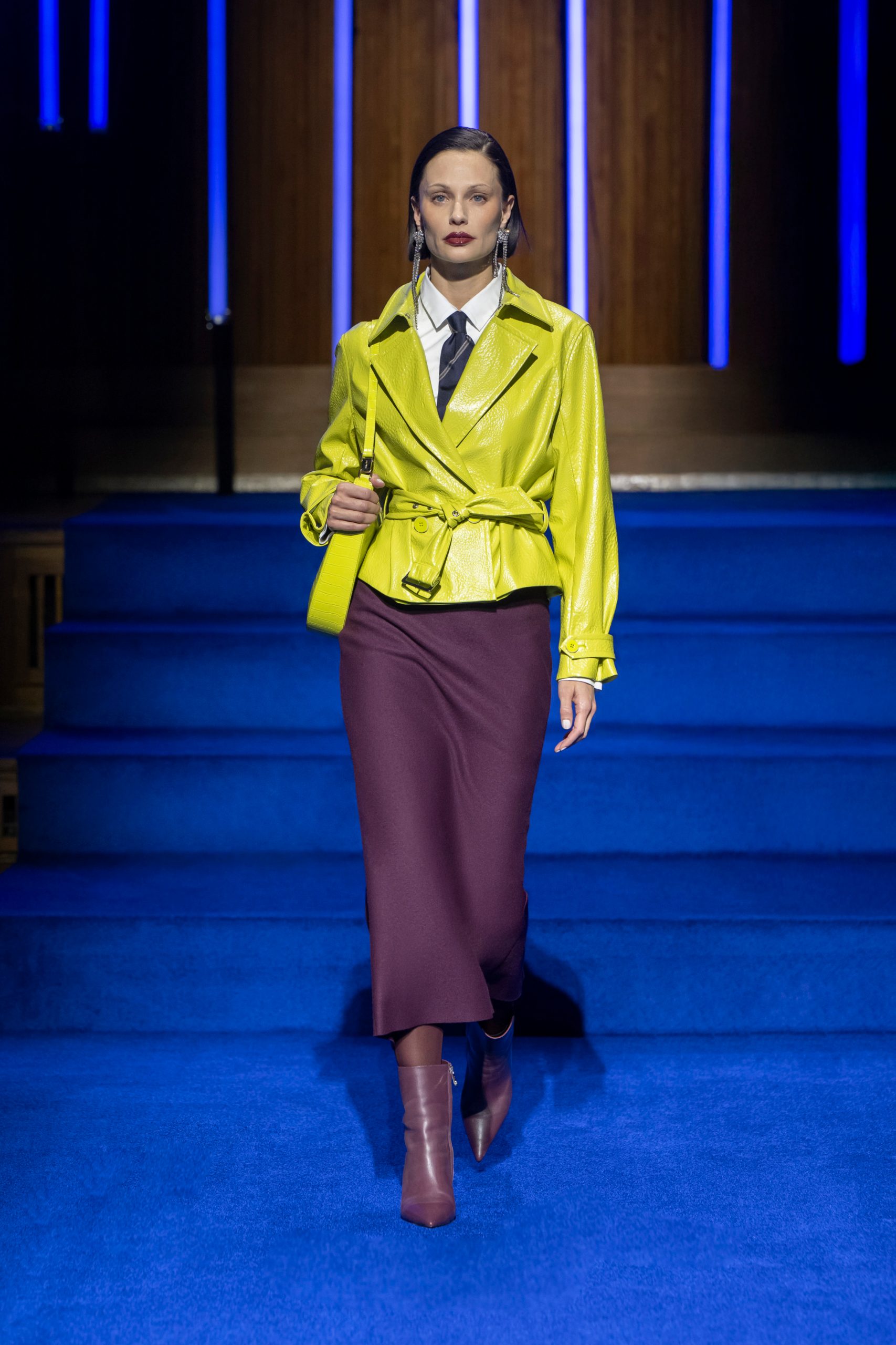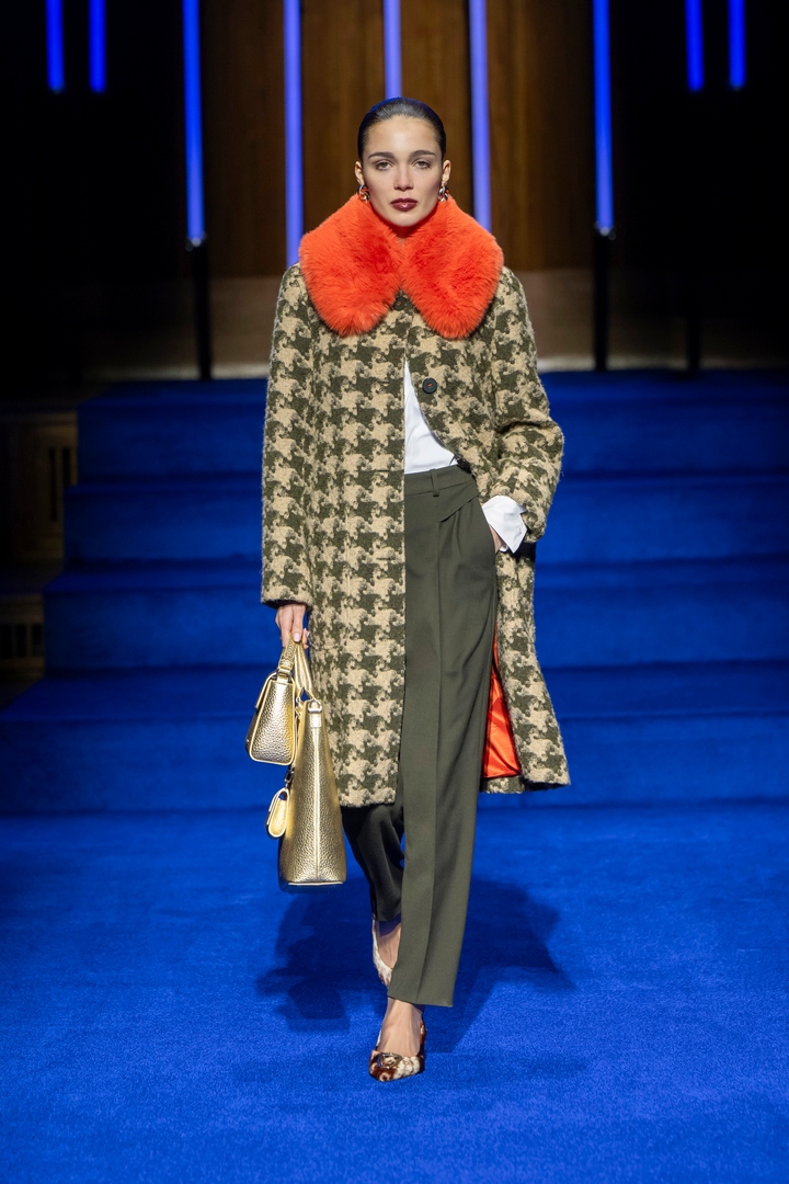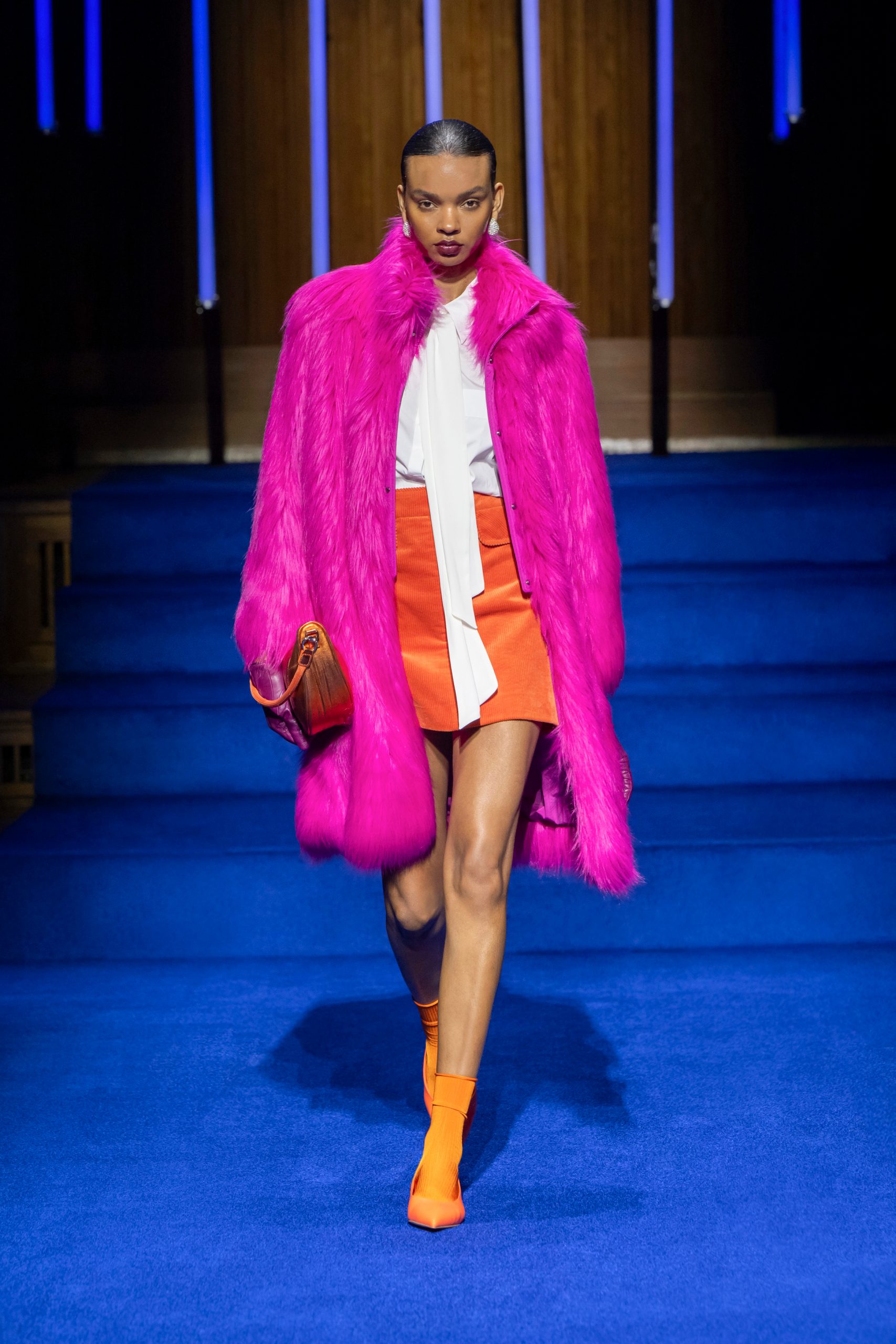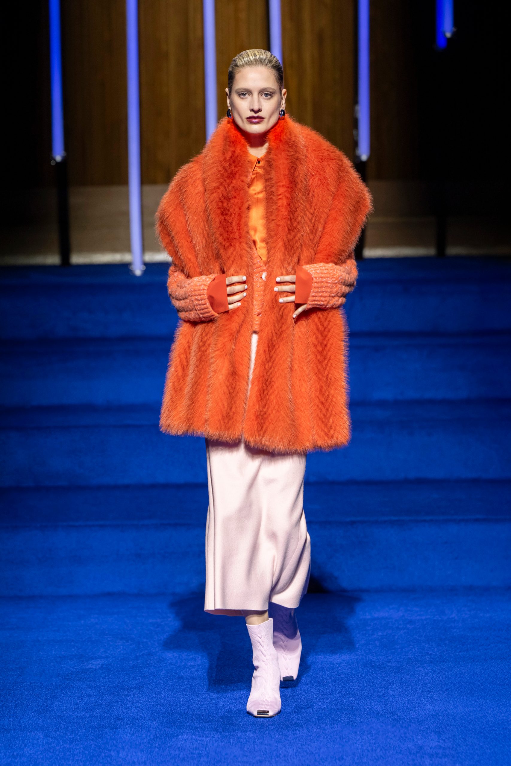 warme, erdige Töne und gewann an Tiefe. Starke Materialien wie kuscheliger Fake Fur in überraschenden Nuancen wie Orange oder Pink brachten einen selbstbewussten Seventies-Vibe auf den Runway, während Leder und Veloursleder den Looks eine moderne, urbane Coolness verliehen. Farblich wurde es mutig und maximal: von edlem Grau mit zartem Rosa bis hin zu elektrisierendem Colourmix. Orange, Aubergine, Pink, Limonello oder Grasgrün trafen bewusst aufeinander – Dopamin Dressing pur.