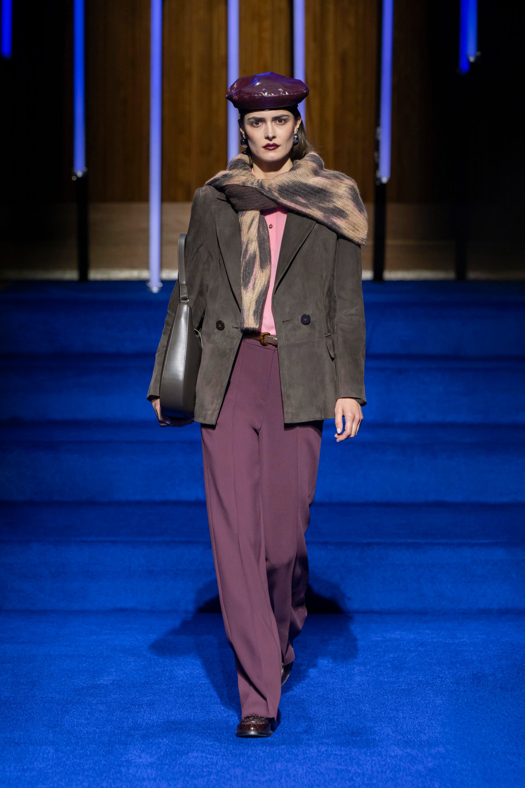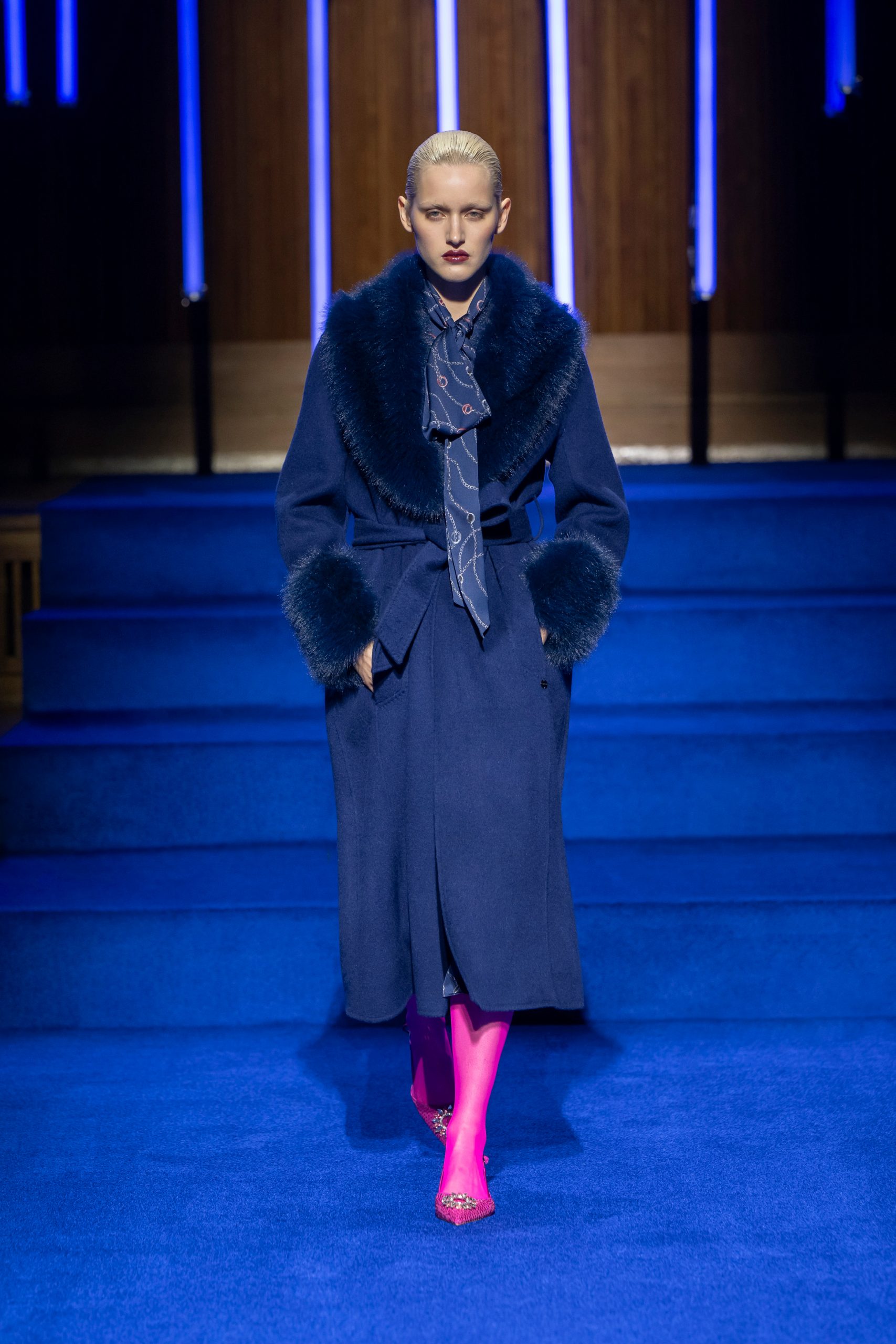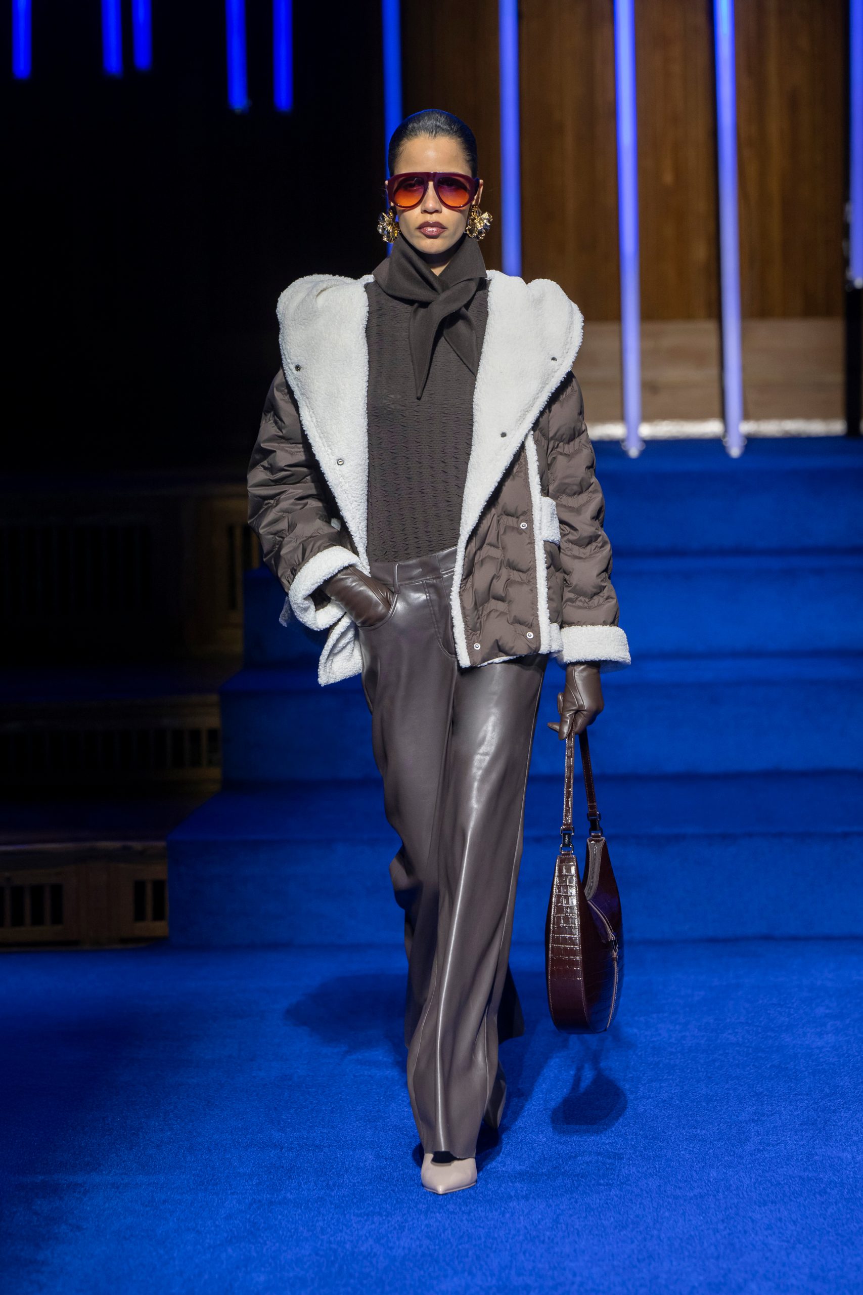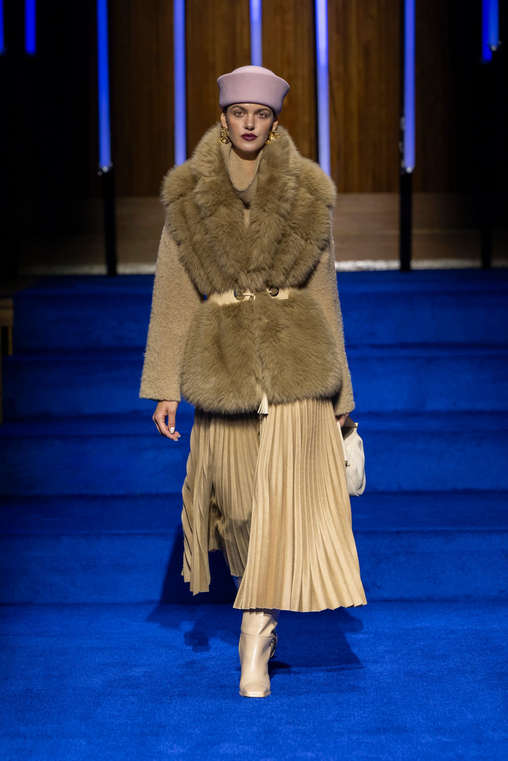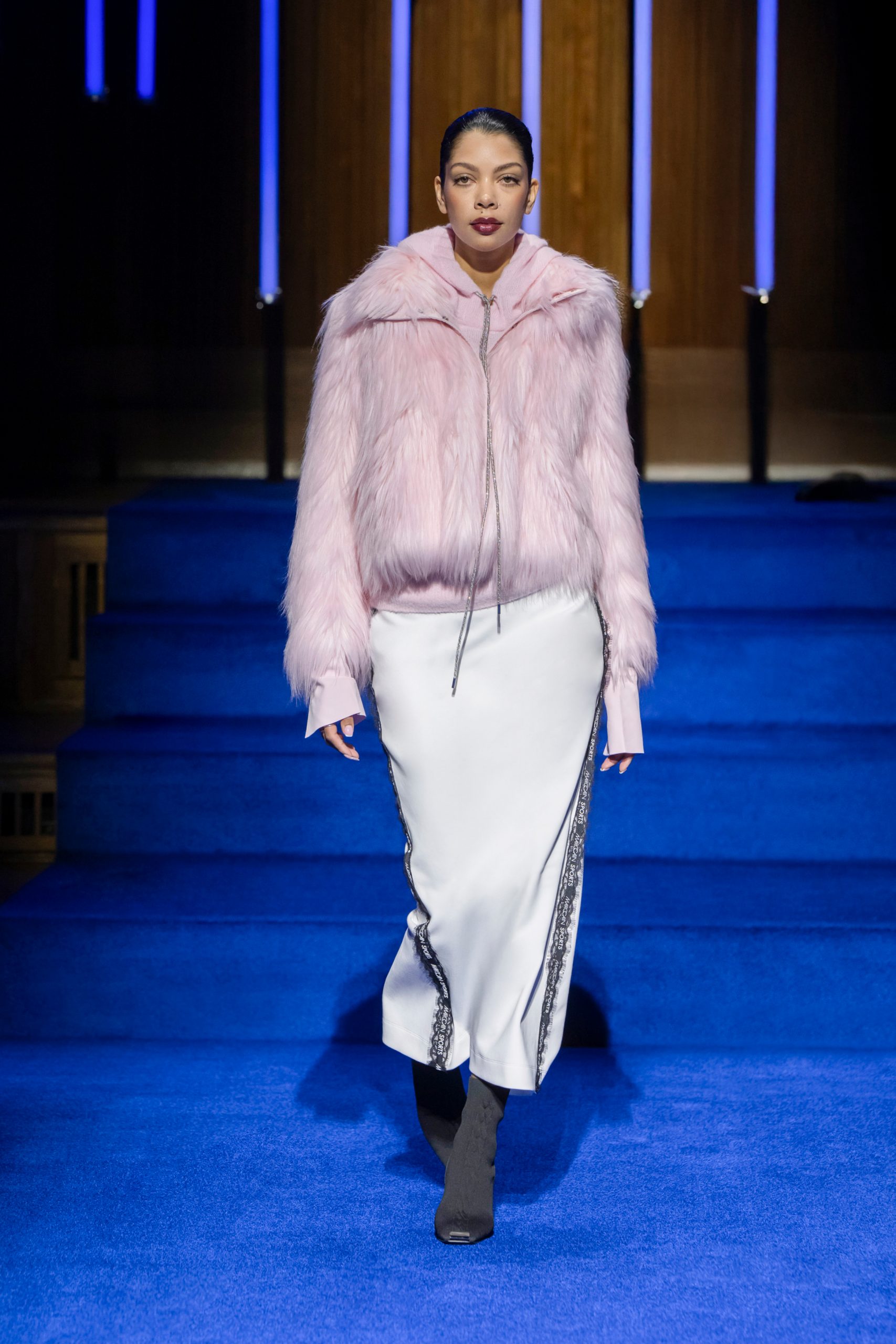 warme, erdige Töne und gewann an Tiefe. Starke Materialien wie kuscheliger Fake Fur in überraschenden Nuancen wie Orange oder Pink brachten einen selbstbewussten Seventies-Vibe auf den Runway, während Leder und Veloursleder den Looks eine moderne, urbane Coolness verliehen. Farblich wurde es mutig und maximal: von edlem Grau mit zartem Rosa bis hin zu elektrisierendem Colourmix. Orange, Aubergine, Pink, Limonello oder Grasgrün trafen bewusst aufeinander – Dopamin Dressing pur.