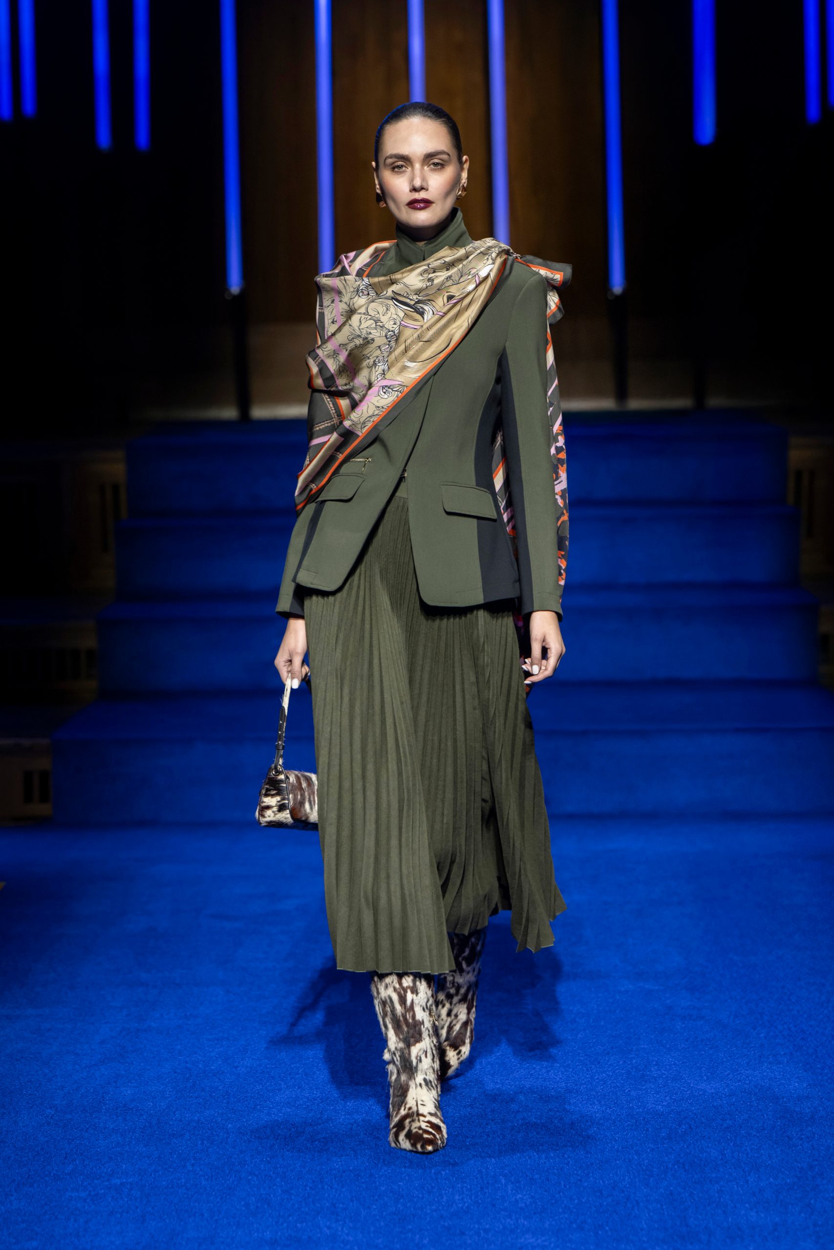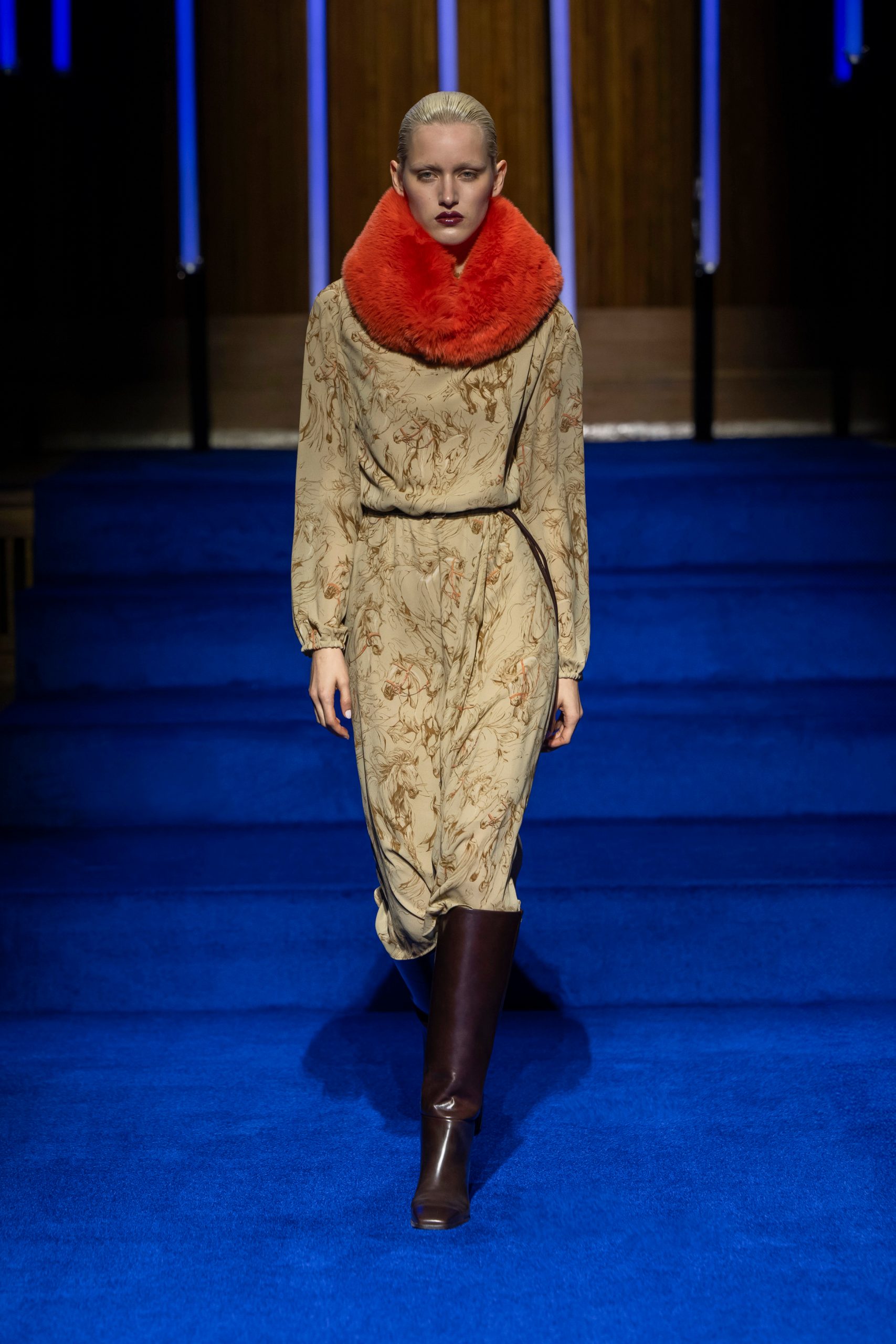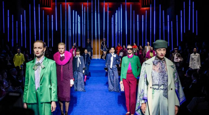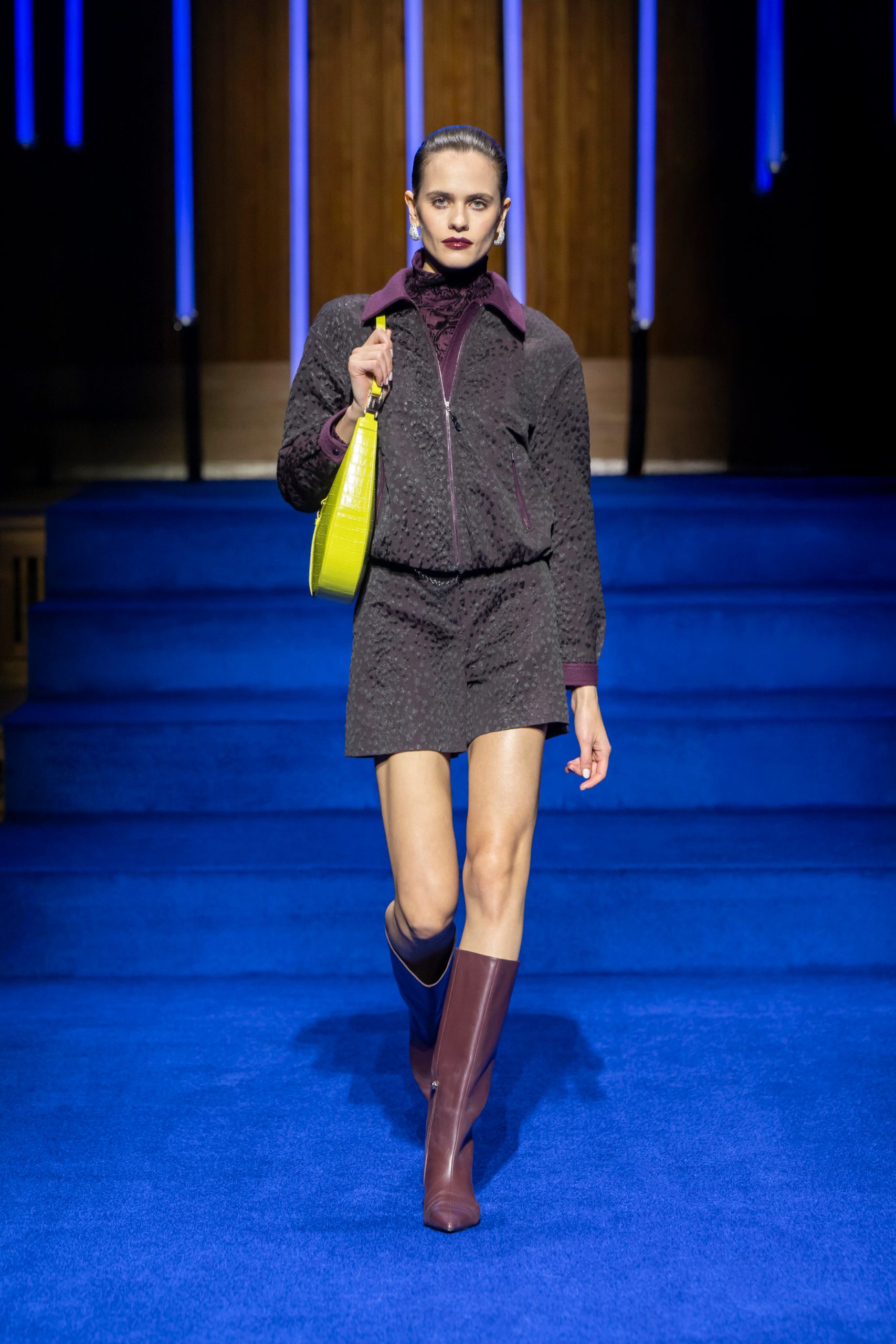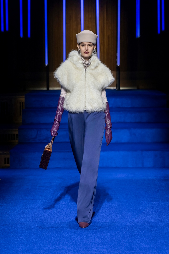 warme, erdige Töne und gewann an Tiefe. Starke Materialien wie kuscheliger Fake Fur in überraschenden Nuancen wie Orange oder Pink brachten einen selbstbewussten Seventies-Vibe auf den Runway, während Leder und Veloursleder den Looks eine moderne, urbane Coolness verliehen. Farblich wurde es mutig und maximal: von edlem Grau mit zartem Rosa bis hin zu elektrisierendem Colourmix. Orange, Aubergine, Pink, Limonello oder Grasgrün trafen bewusst aufeinander – Dopamin Dressing pur.