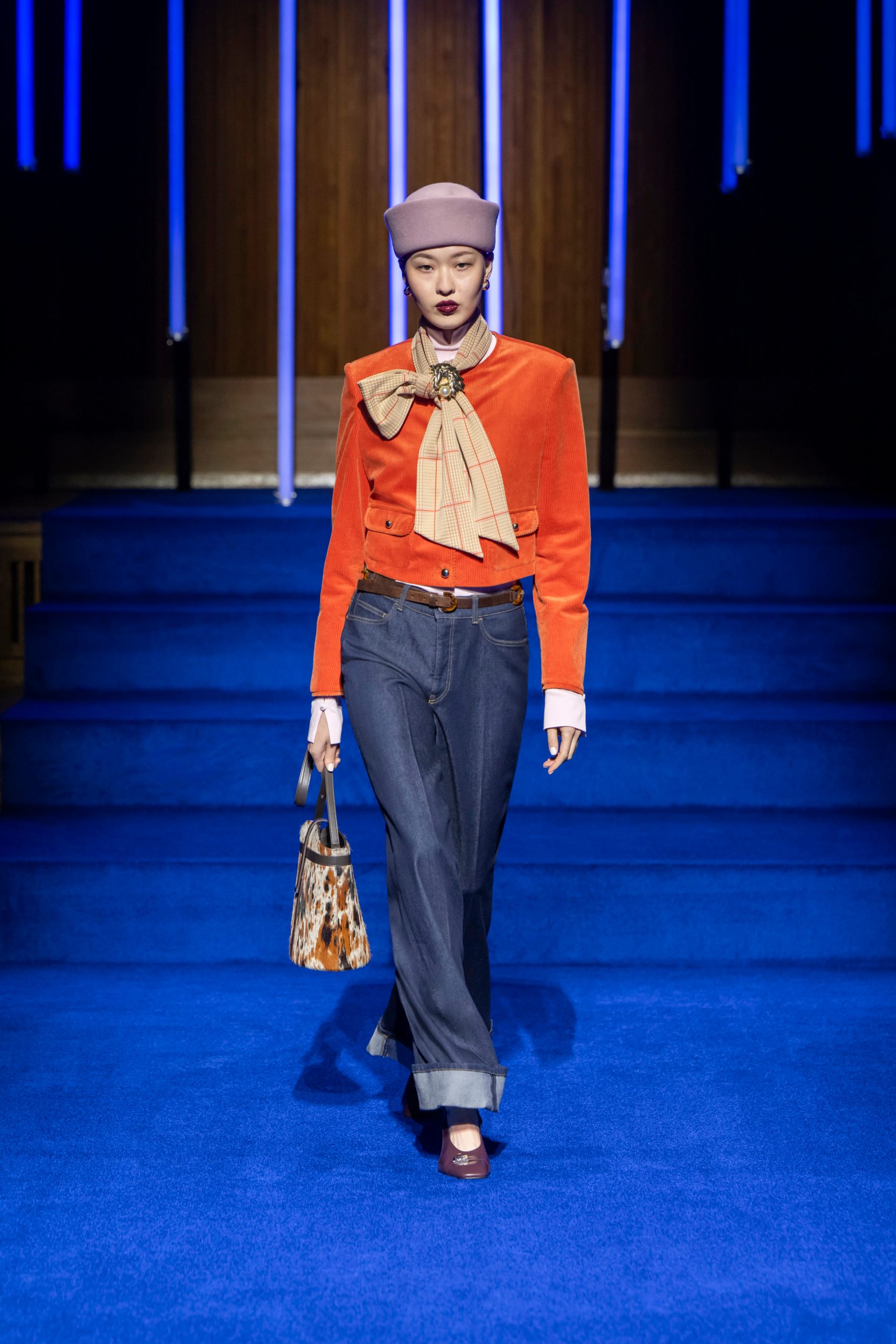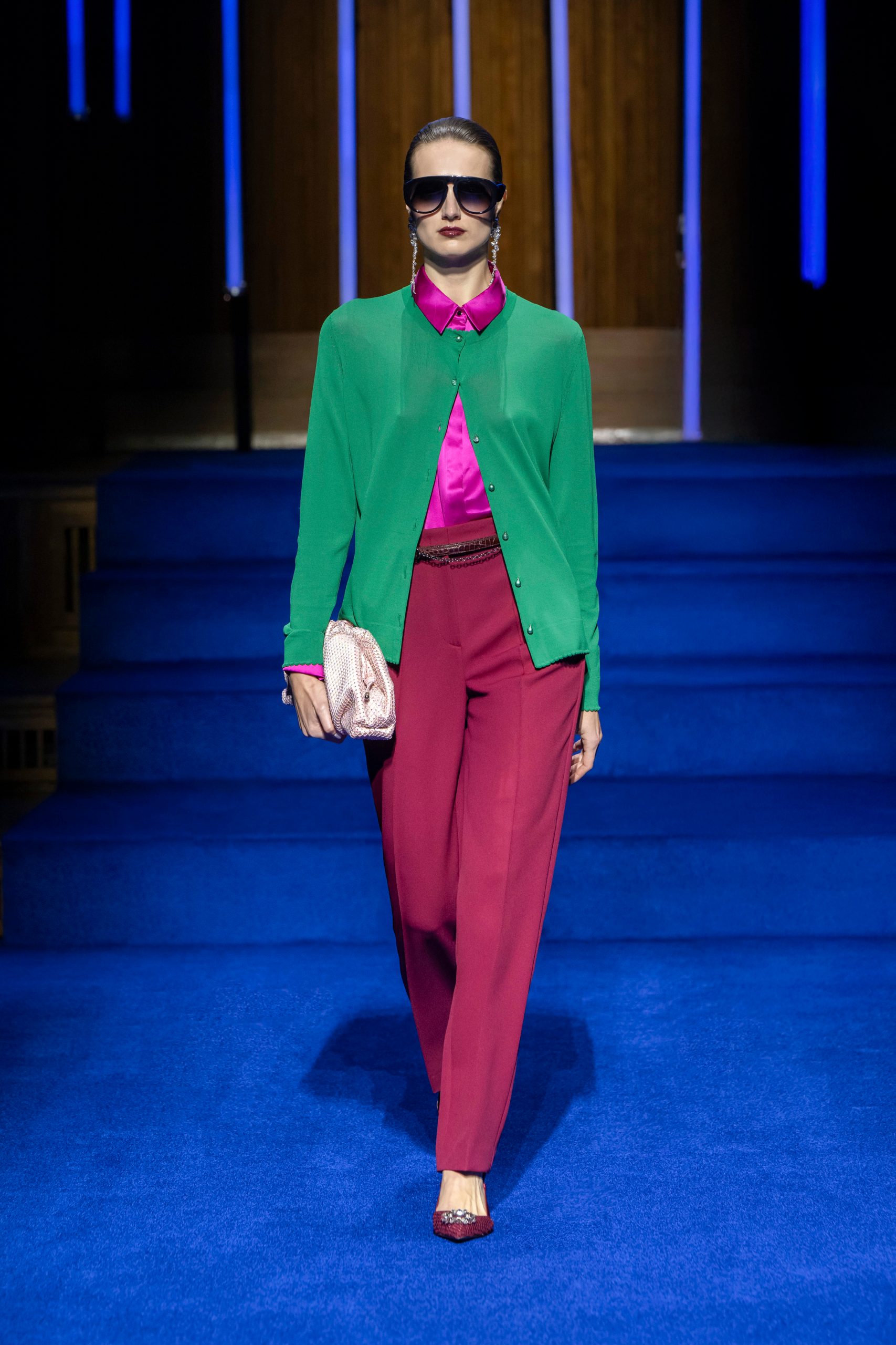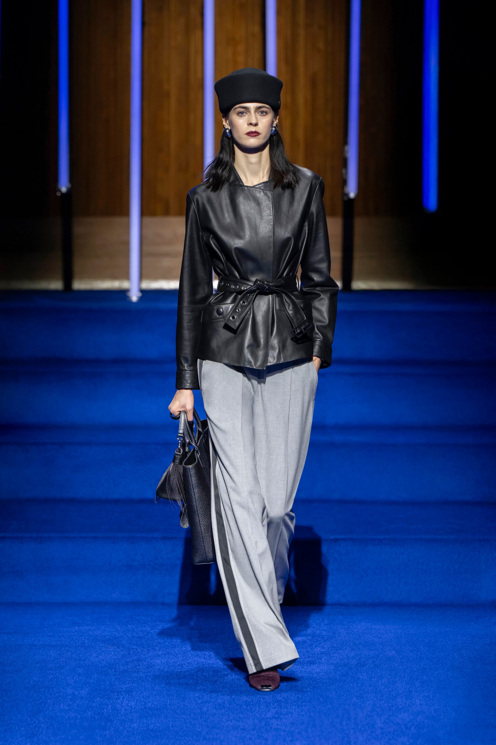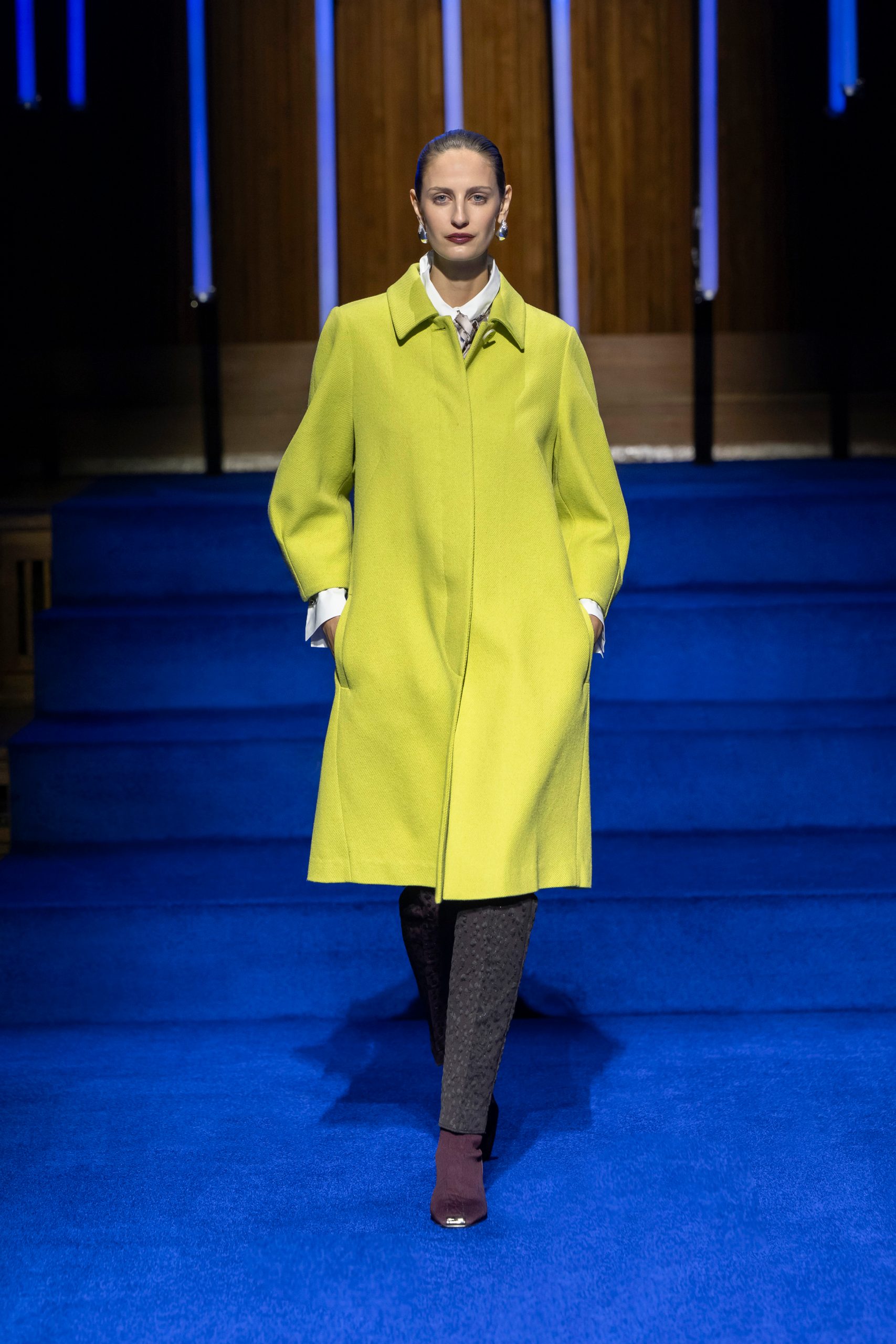 warme, erdige Töne und gewann an Tiefe. Starke Materialien wie kuscheliger Fake Fur in überraschenden Nuancen wie Orange oder Pink brachten einen selbstbewussten Seventies-Vibe auf den Runway, während Leder und Veloursleder den Looks eine moderne, urbane Coolness verliehen. Farblich wurde es mutig und maximal: von edlem Grau mit zartem Rosa bis hin zu elektrisierendem Colourmix. Orange, Aubergine, Pink, Limonello oder Grasgrün trafen bewusst aufeinander – Dopamin Dressing pur.