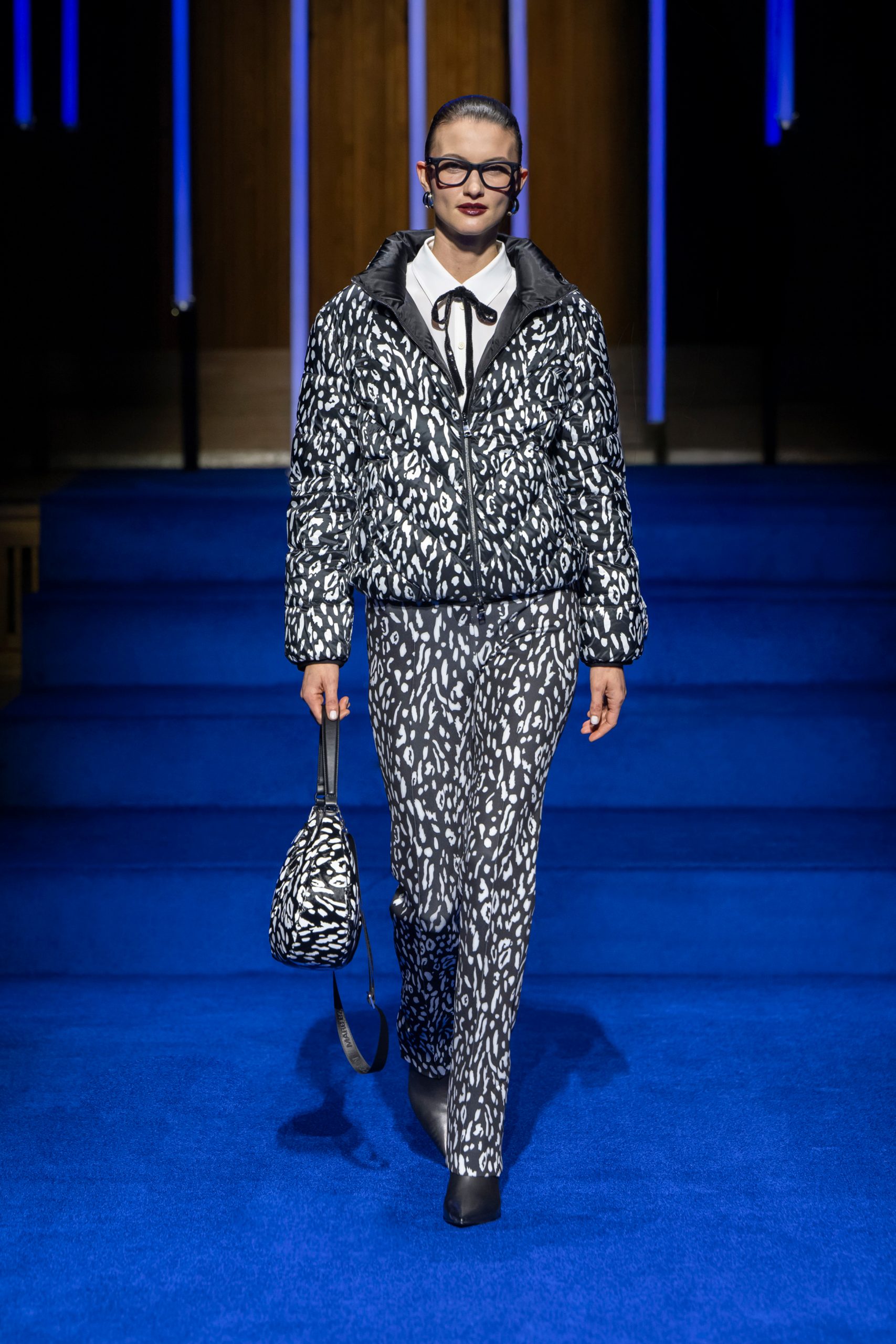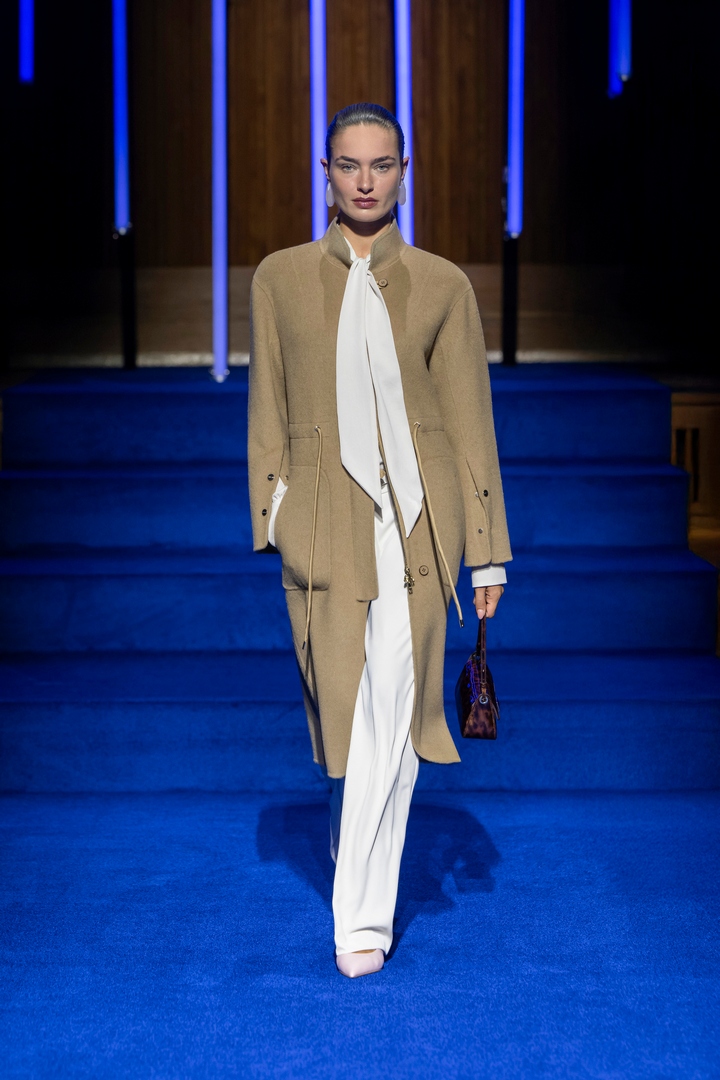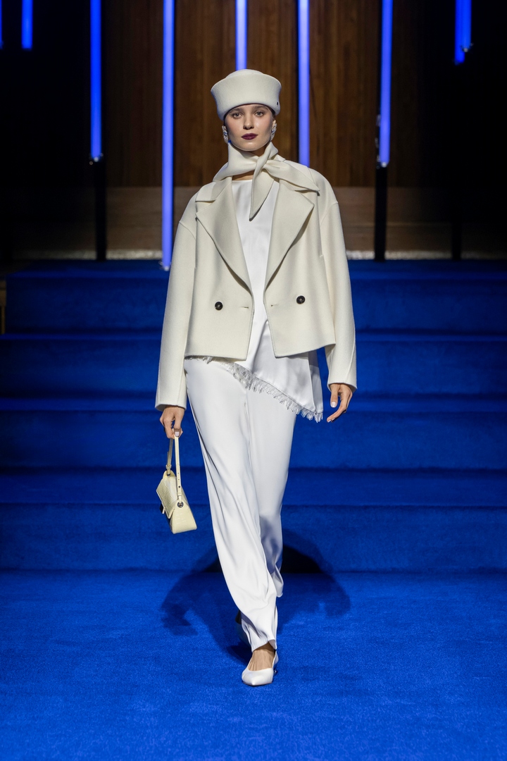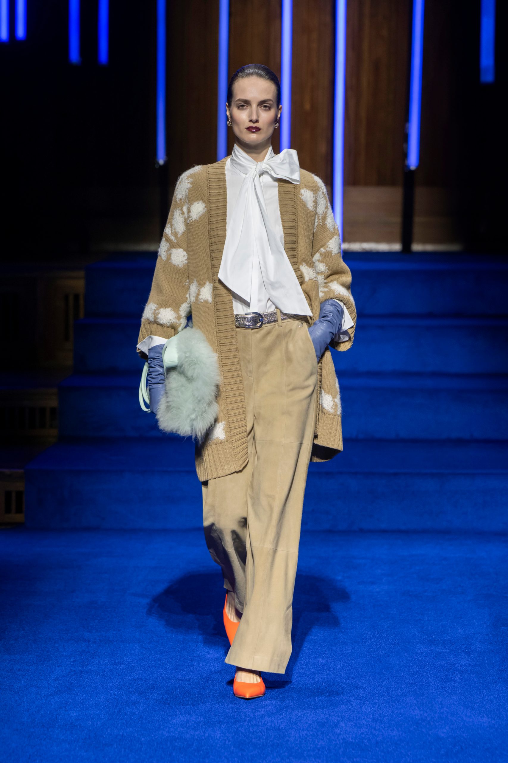 Zu Beginn zeigten die Looks eine helle Farbwelt – ganz im Spirit der Pantone-Farbe des Jahres Cloud Dancer. Weiche Stricklooks mit außergewöhnlichem Ozelotmuster setzten sich kraftvoll vom blauen Boden ab. Nach und nach wandelte sich das Farbspektrum in