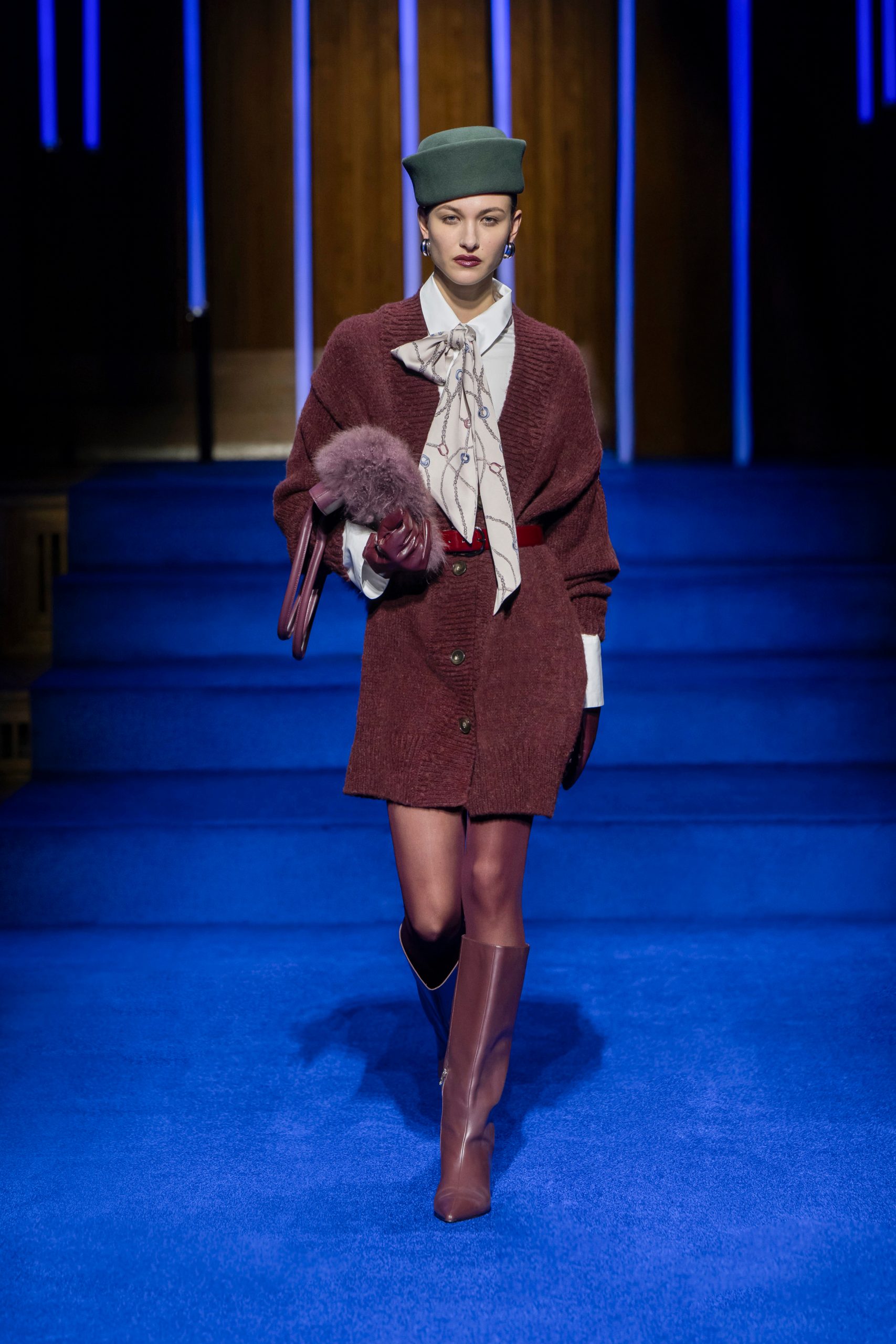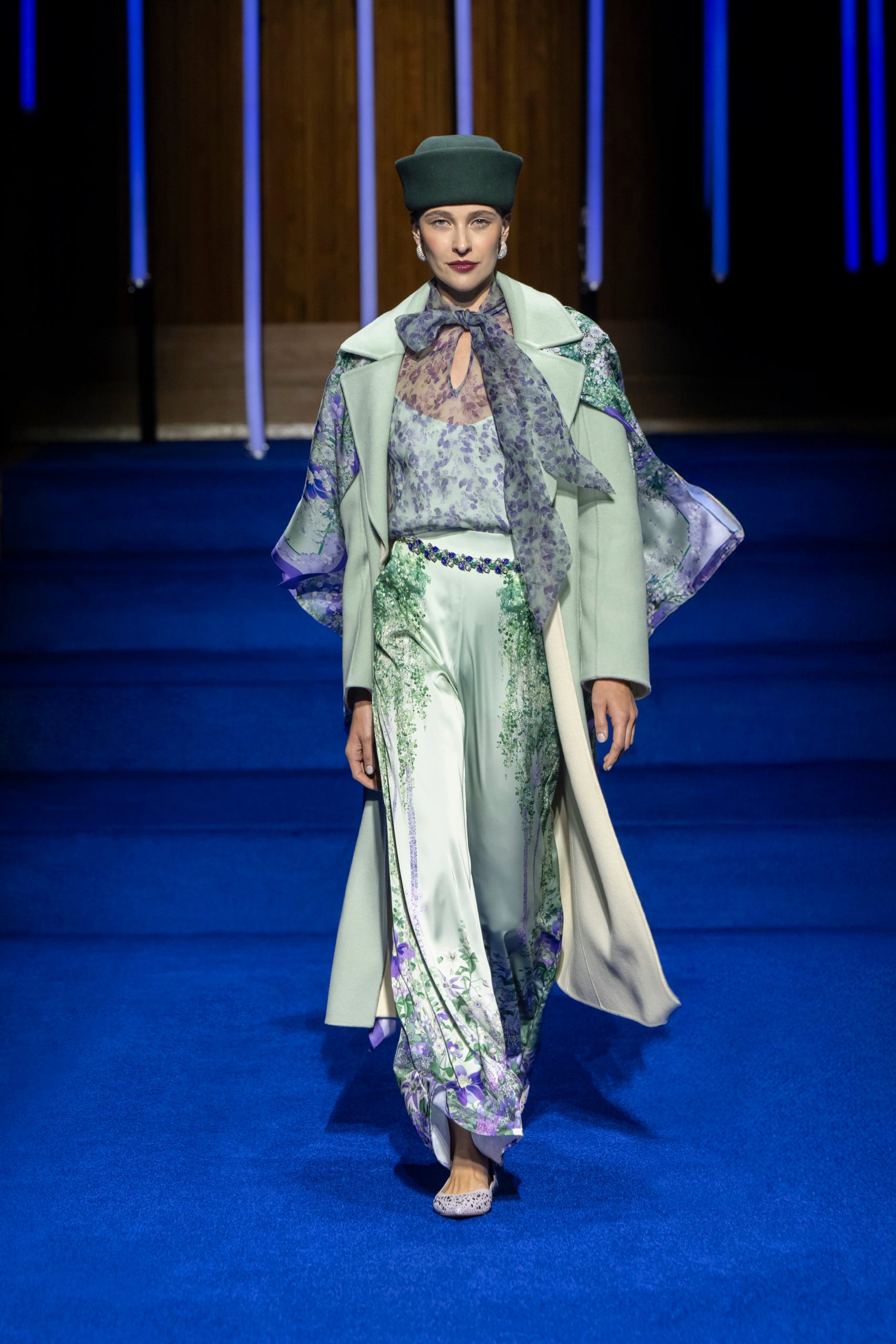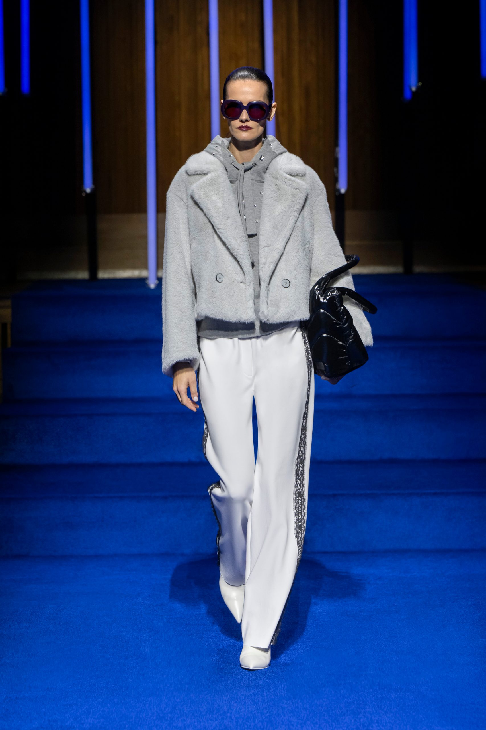 Zu Beginn zeigten die Looks eine helle Farbwelt – ganz im Spirit der Pantone-Farbe des Jahres Cloud Dancer. Weiche Stricklooks mit außergewöhnlichem Ozelotmuster setzten sich kraftvoll vom blauen Boden ab. Nach und nach wandelte sich das Farbspektrum in