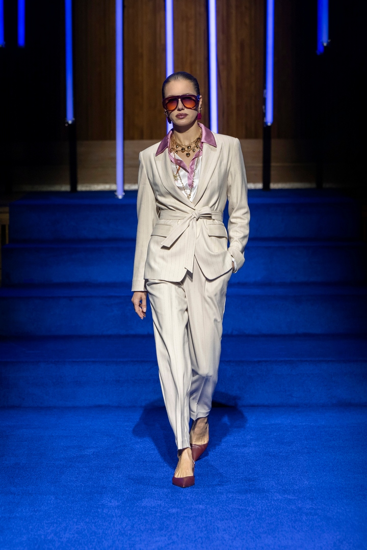 verschmolz mit femininen Details wie Broschen und Schluppen. Zum Finale präsentierte Marc Cain die eleganten Highlights des Labels Glam.