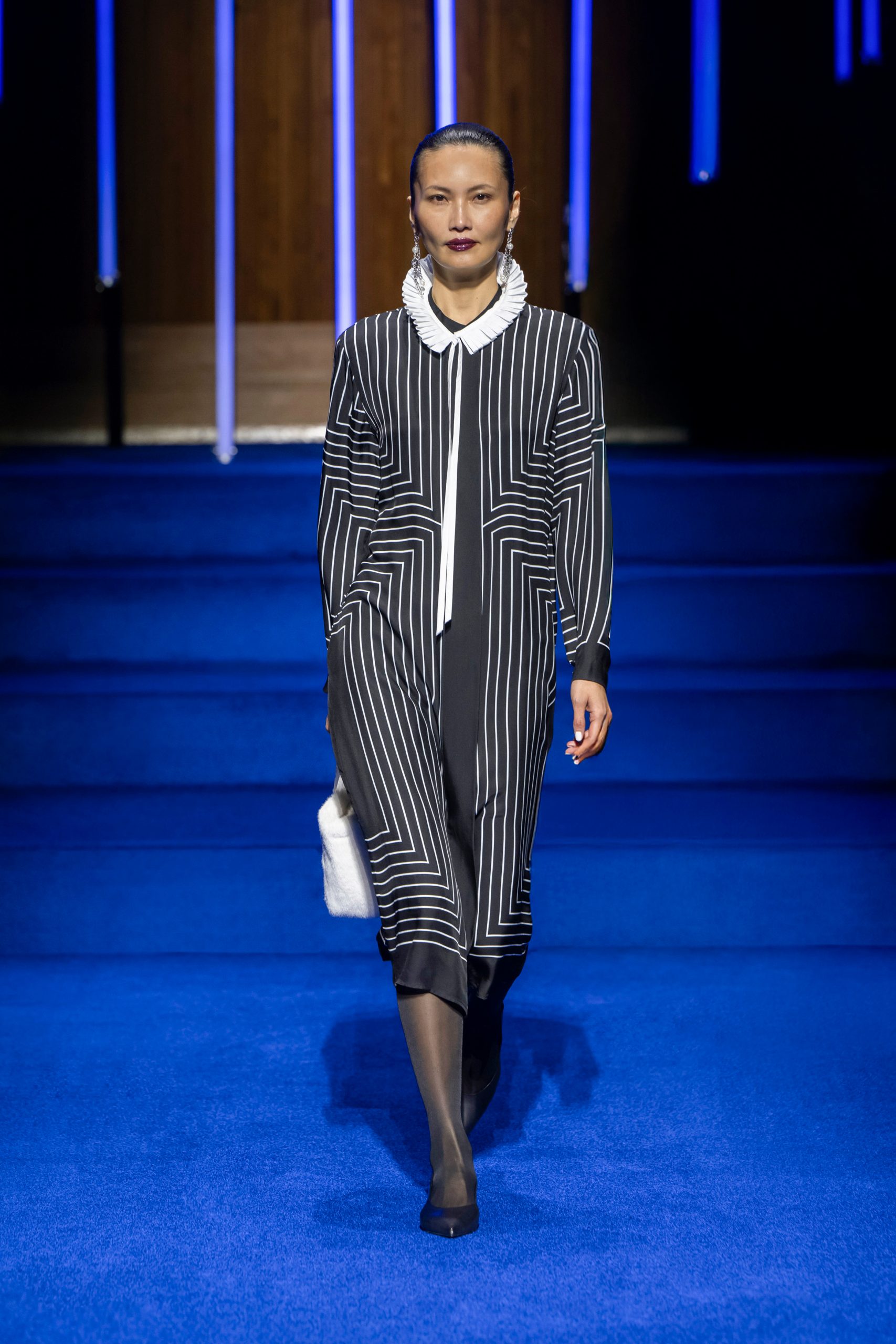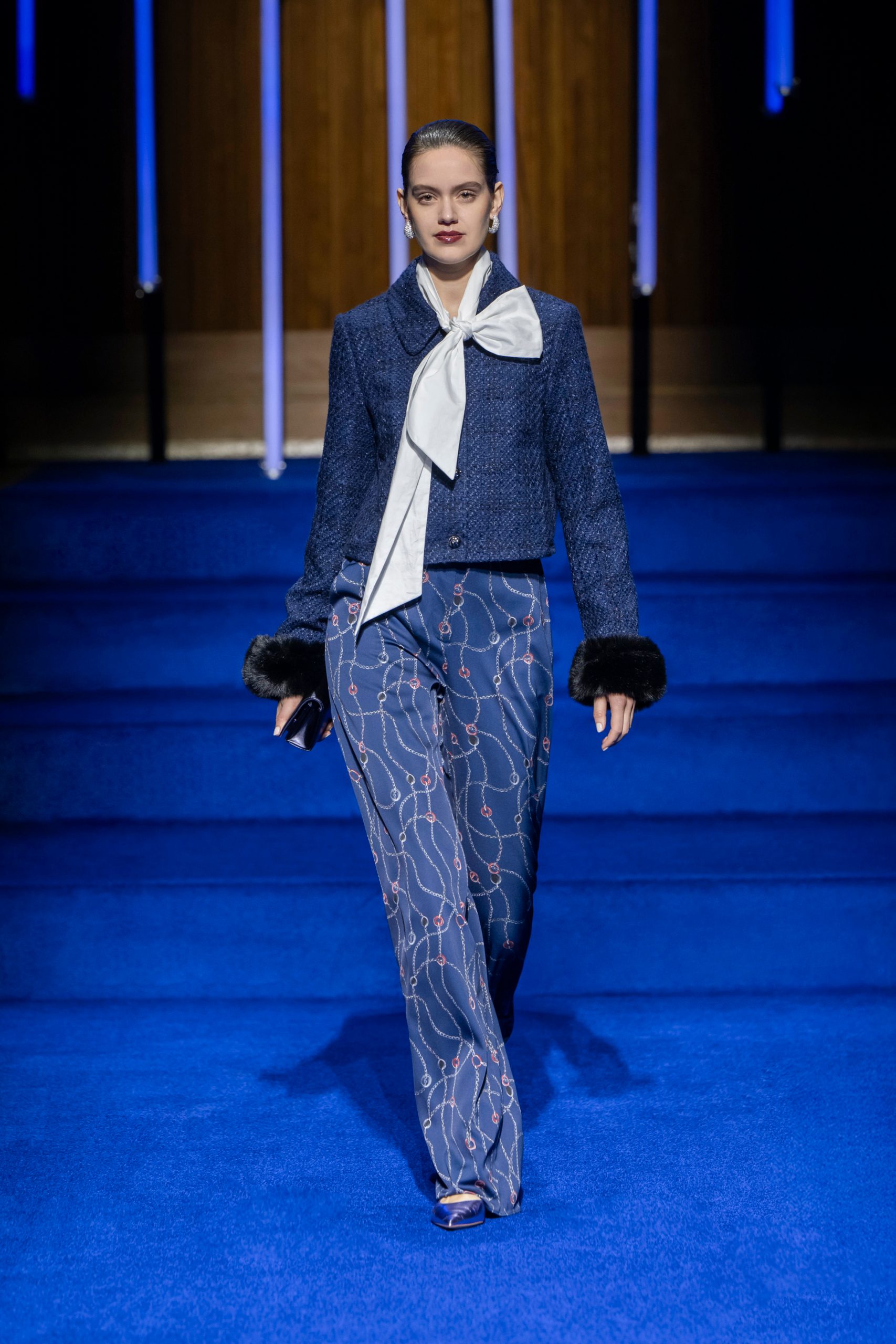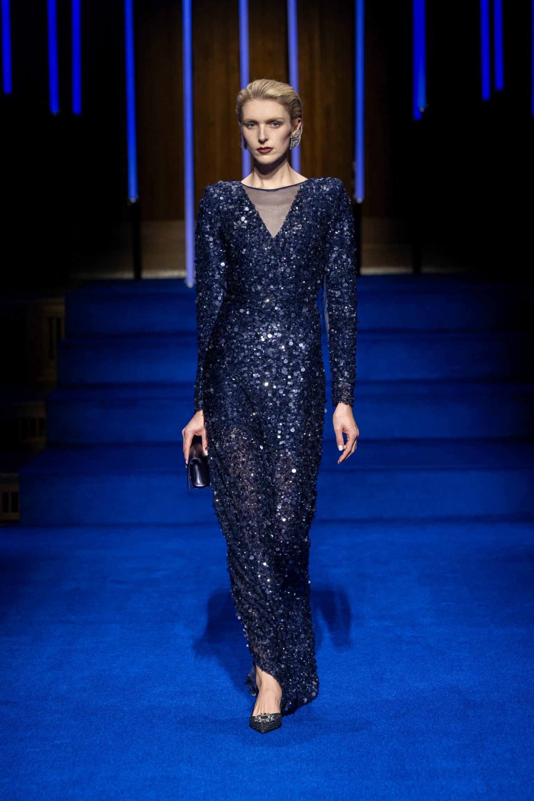 Auch die Inszenierung folgte der Idee von Klang und Rhythmus: In verschiedenen Höhen angeordnete, blau leuchtende LED-Stäbe erinnerten an die Optik eines Equalizers, während blaue Teppiche und das halbrunde Setting den Raum strukturierten. Die Models betraten den Runway hinter den Leuchtstäben und bewegten sich über einen mehr als 70 Meter langen Catwalk, der die Weite des Saals eindrucksvoll zur Geltung brachte.