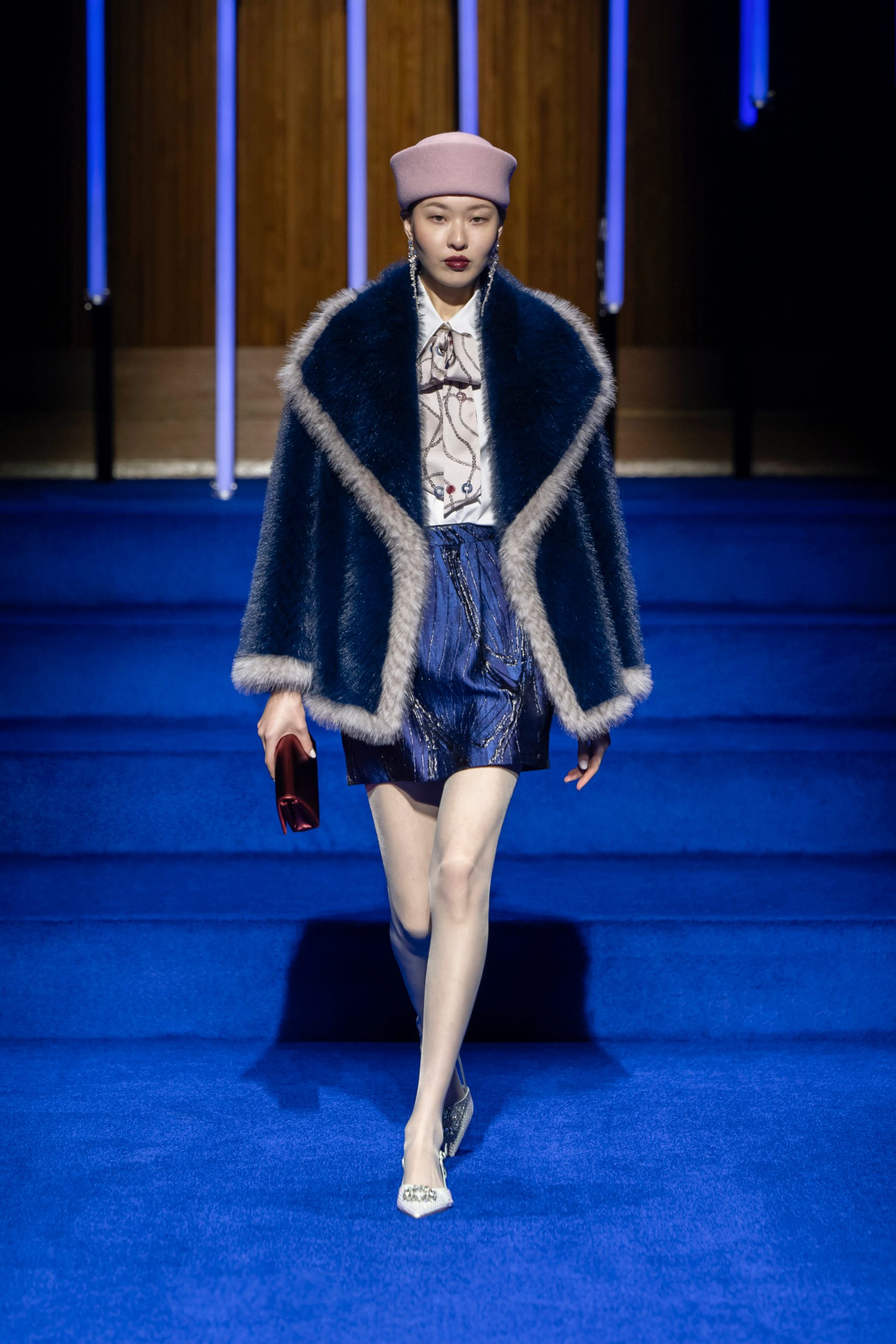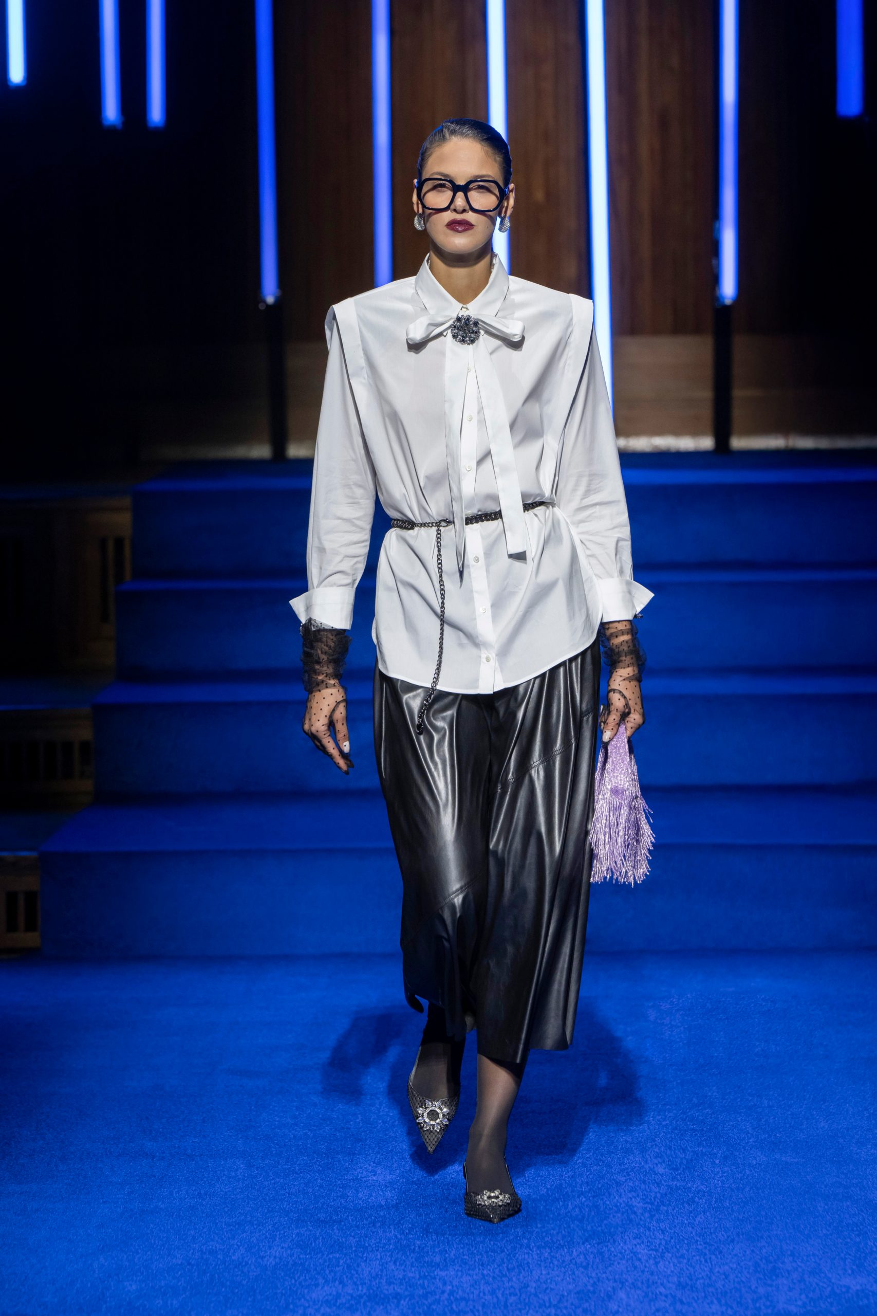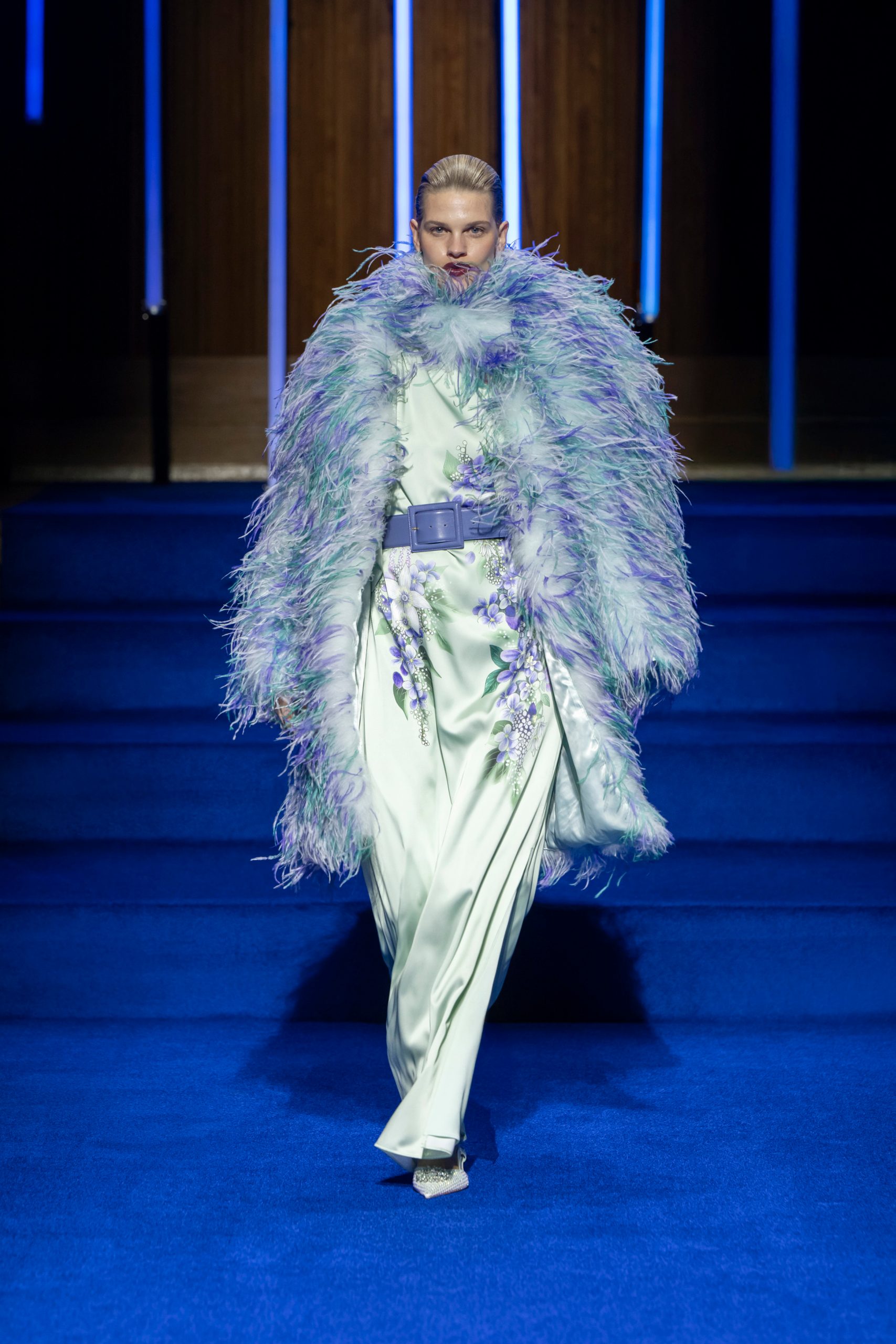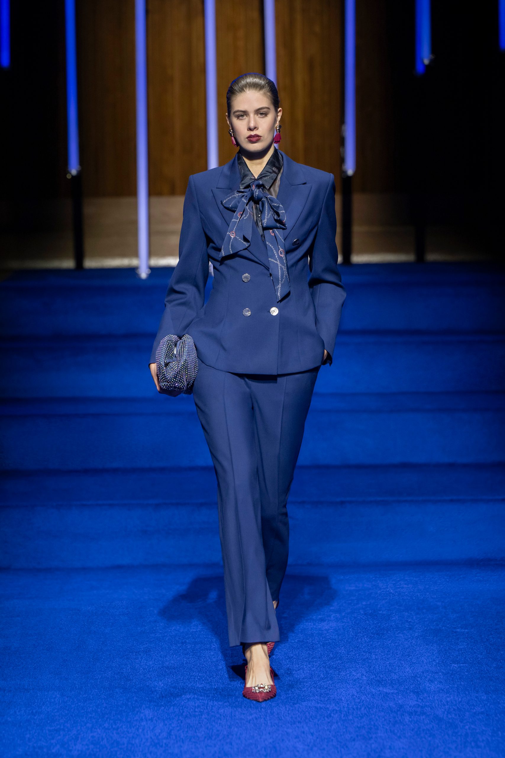 Auch die Inszenierung folgte der Idee von Klang und Rhythmus: In verschiedenen Höhen angeordnete, blau leuchtende LED-Stäbe erinnerten an die Optik eines Equalizers, während blaue Teppiche und das halbrunde Setting den Raum strukturierten. Die Models betraten den Runway hinter den Leuchtstäben und bewegten sich über einen mehr als 70 Meter langen Catwalk, der die Weite des Saals eindrucksvoll zur Geltung brachte.